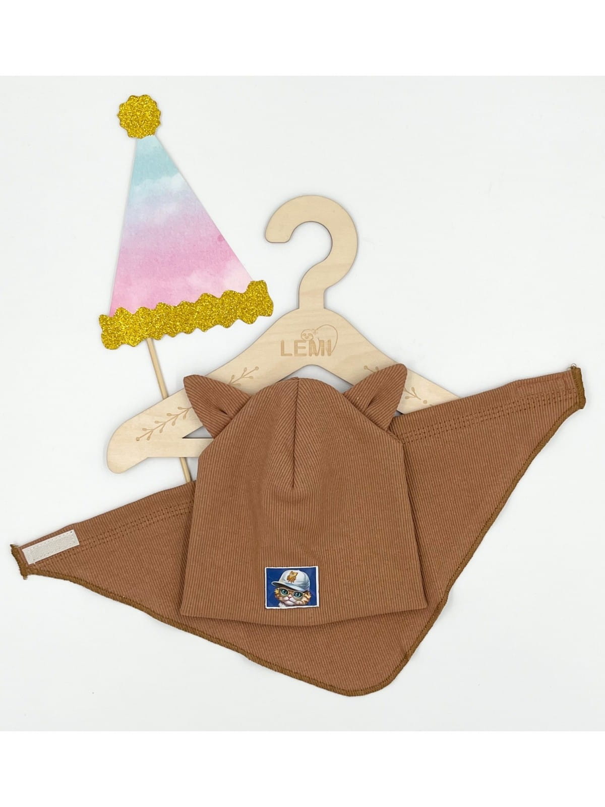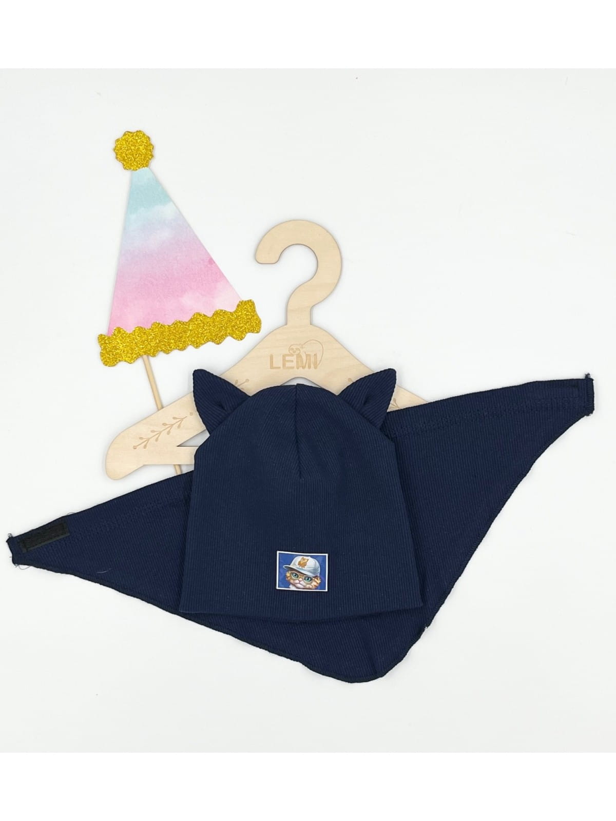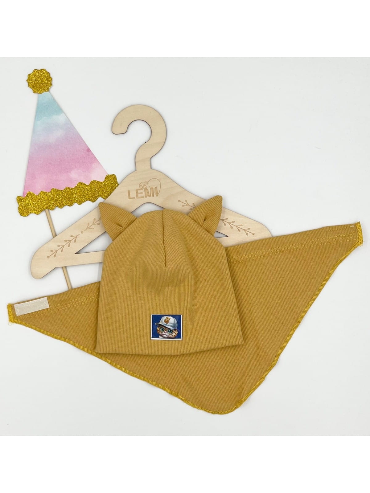 Komplet prążek czapka plus chusta, podwójny materiał czapka. Czapka mierzona na płasko to ok 17,5 cm szeroka, wysoka ok 17,5 cm. Idealna na sezon jesienny jak i na ciepłą zimę. Wiek ok 1 roku. Z przodu wizerunek kotka. Ozdobą są super kocie uszy.
