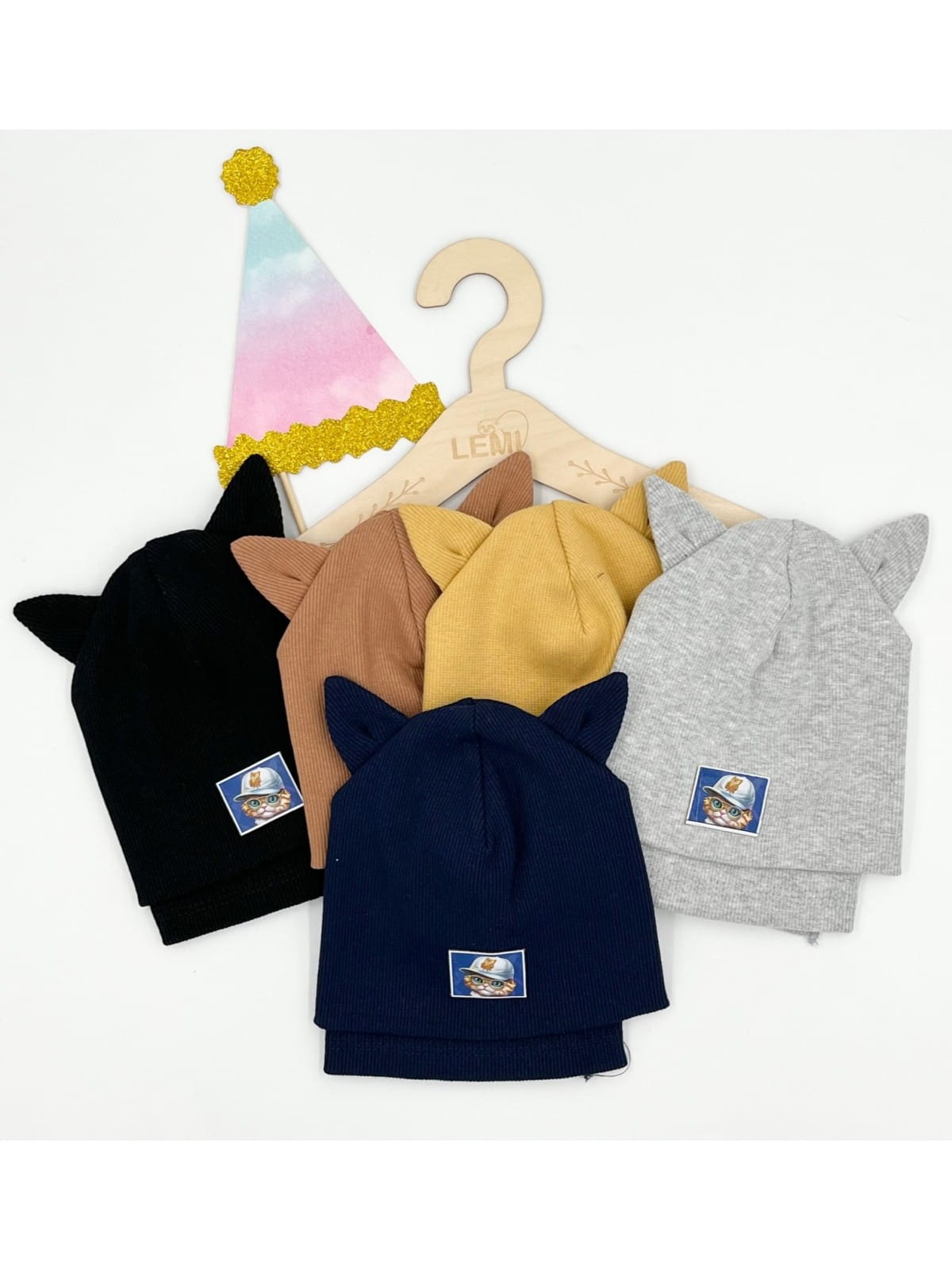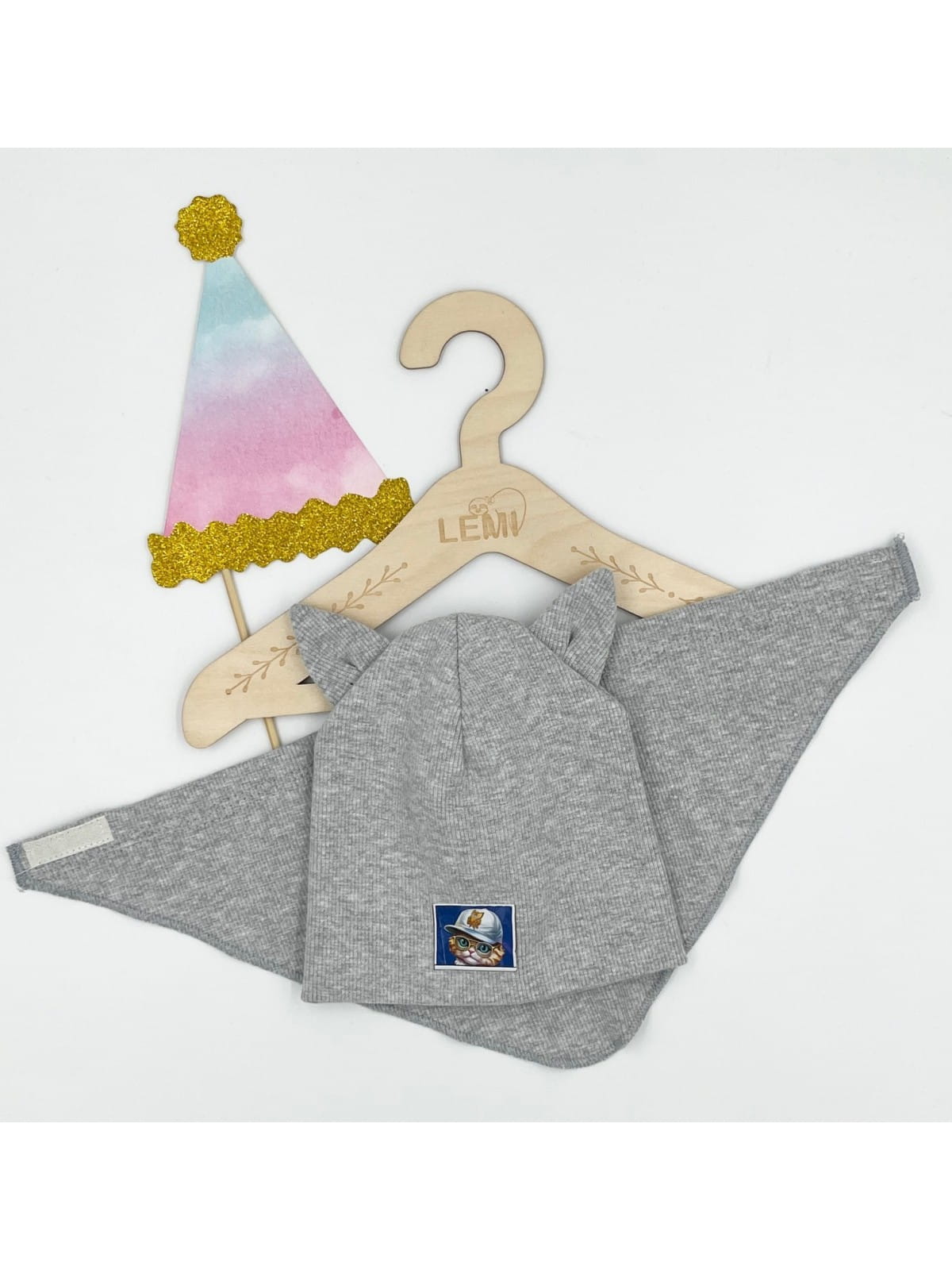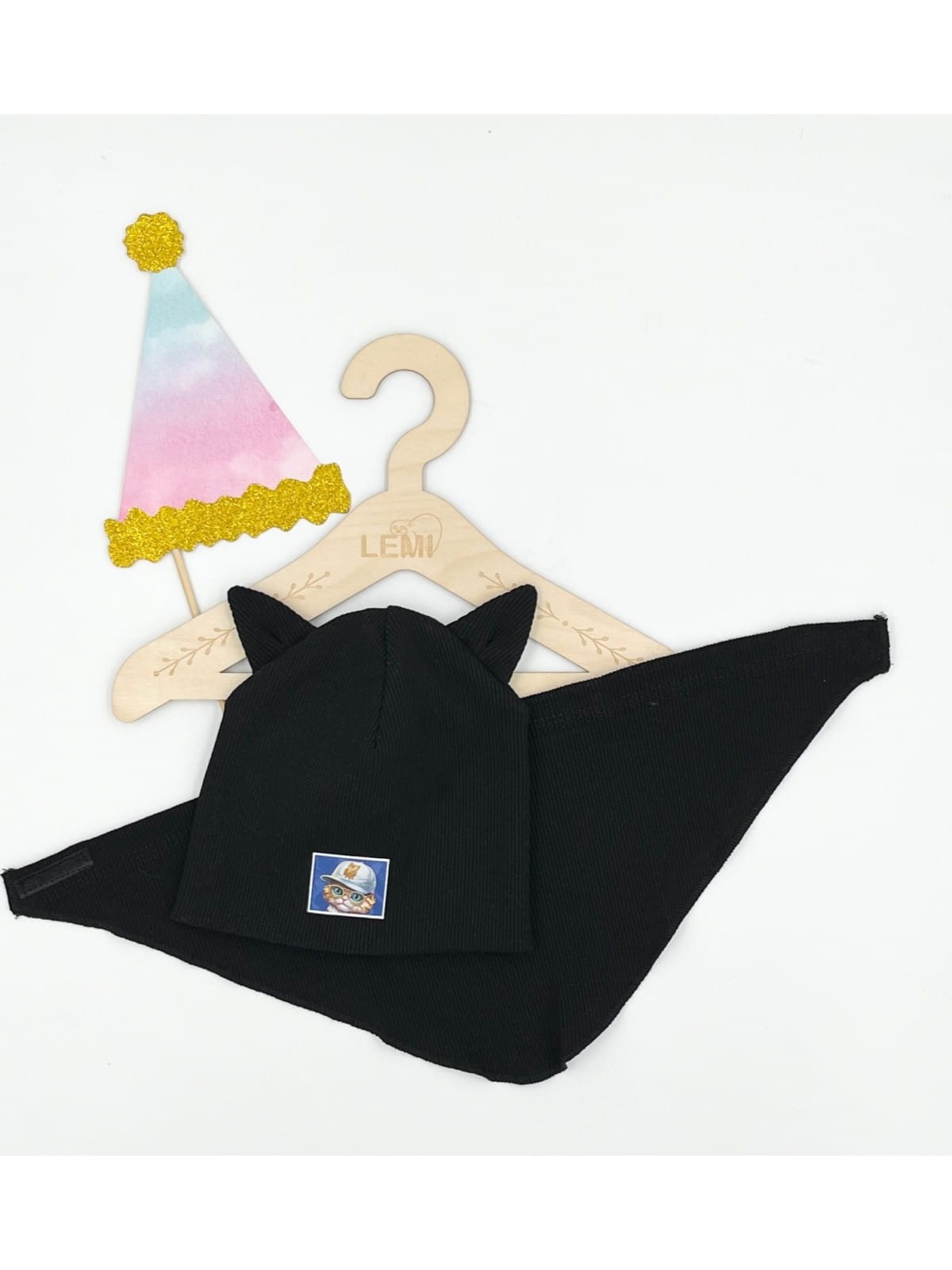 Komplet prążek czapka plus chusta, podwójny materiał czapka. Czapka mierzona na płasko to ok 17,5 cm szeroka, wysoka ok 17,5 cm. Idealna na sezon jesienny jak i na ciepłą zimę. Wiek ok 1 roku. Z przodu wizerunek kotka. Ozdobą są super kocie uszy.