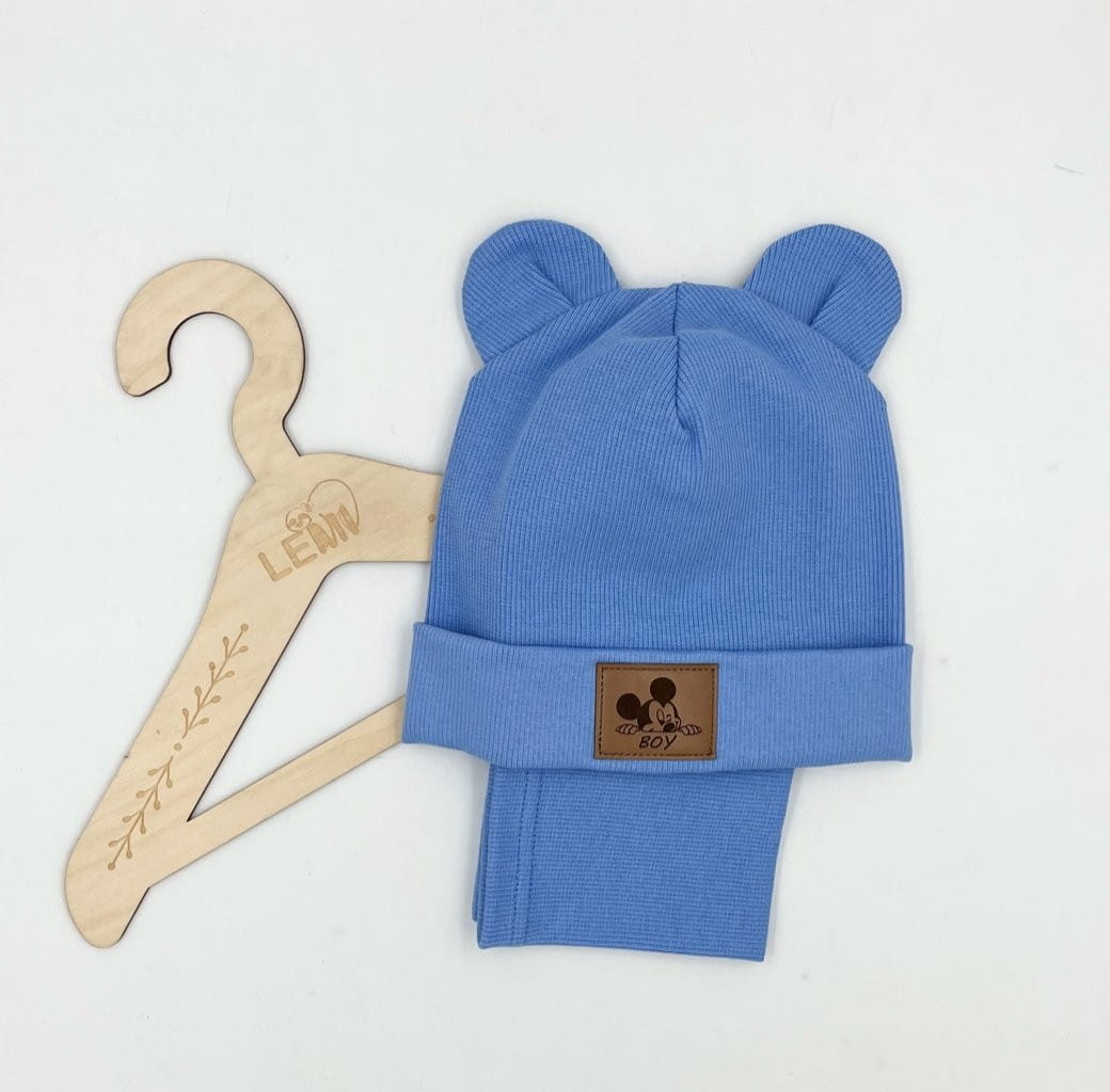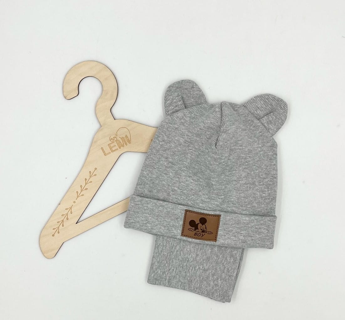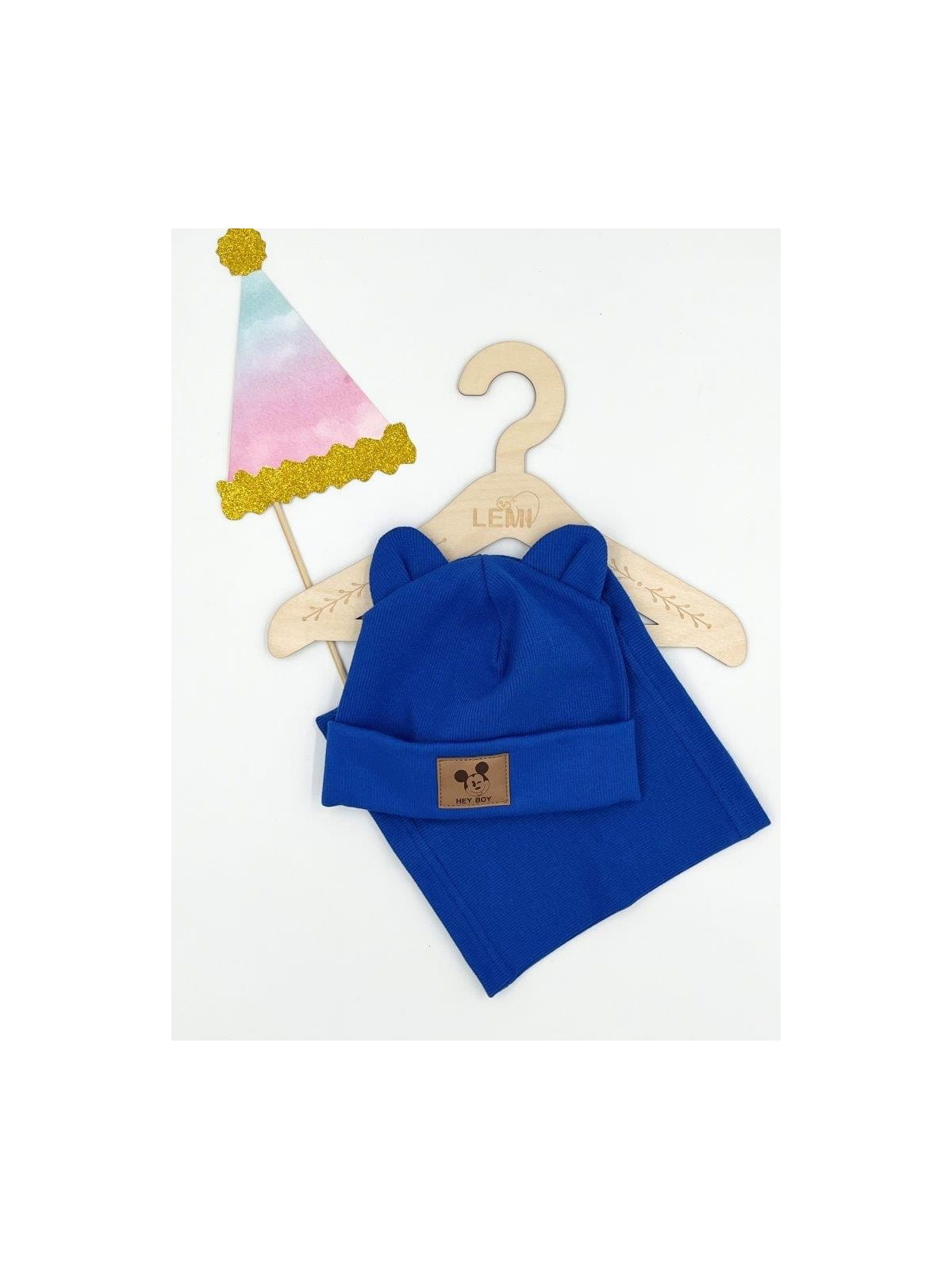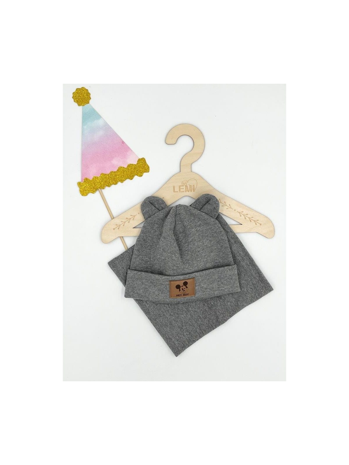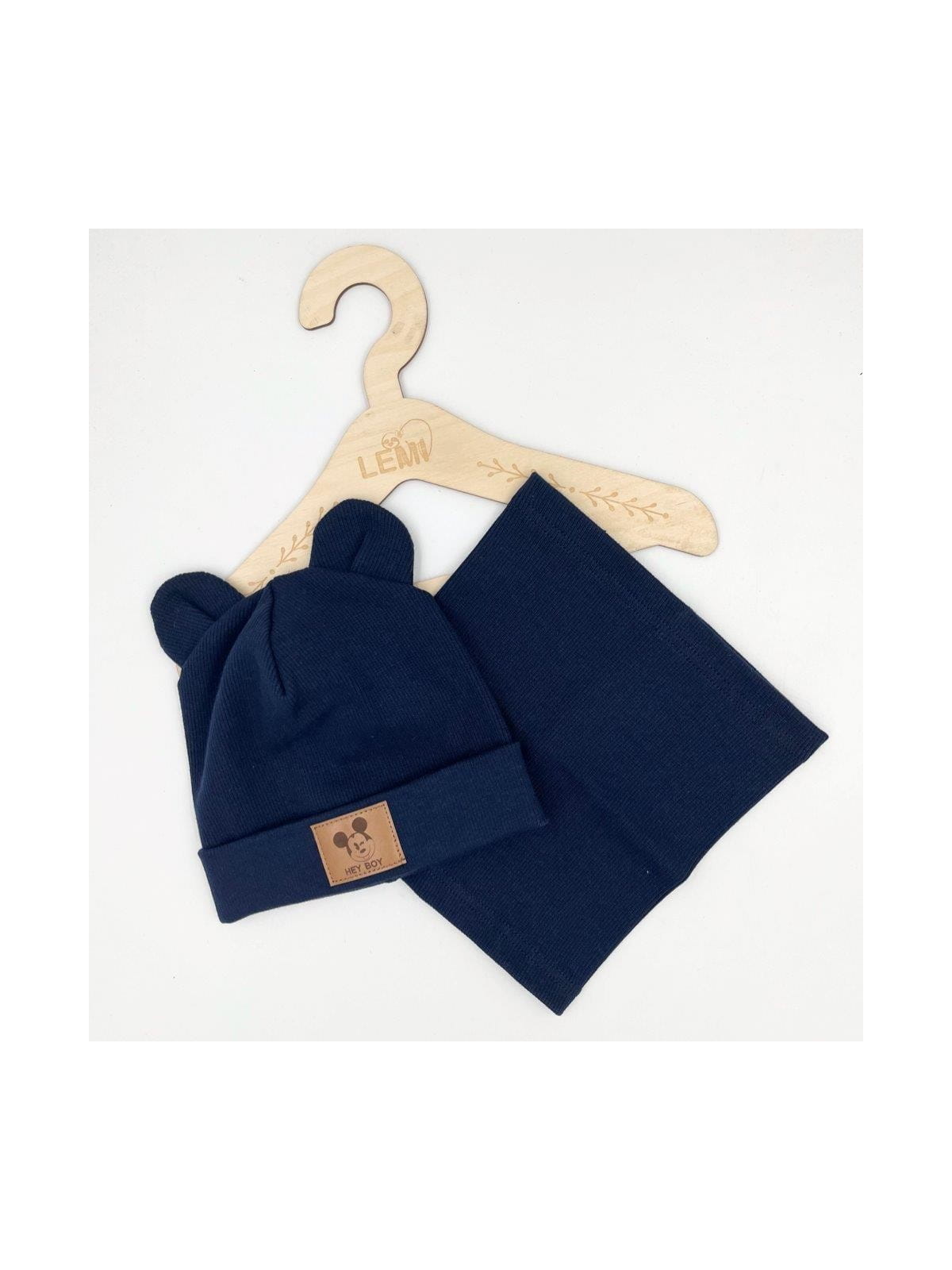 Komplet chłopięcy – czapka i komin USZKI TK dla dzieci. Polska produkcja, pojedynczy materiał bawełniany (95% bawełna, 5% elastan), wywijana czapka z uszkami, ozdobna naszywka ze skóry ekologicznej, idealny na jesień.