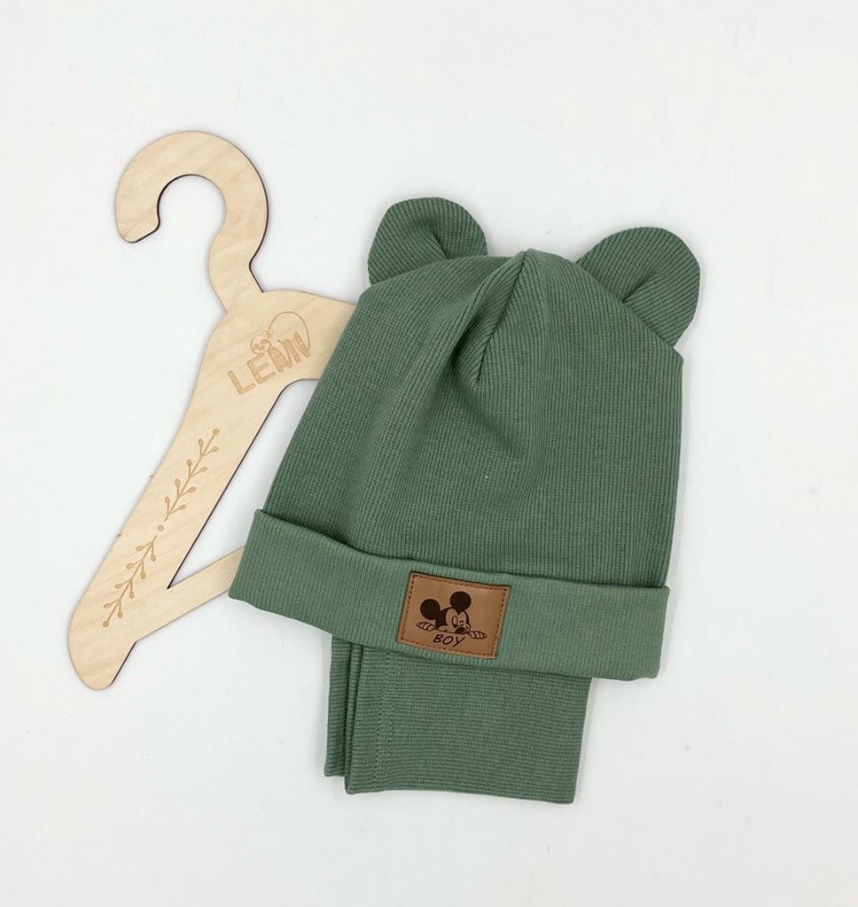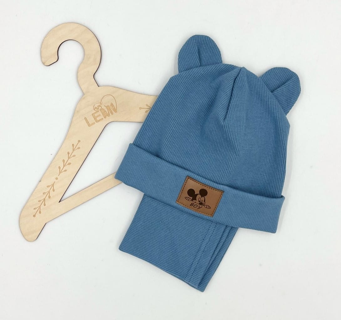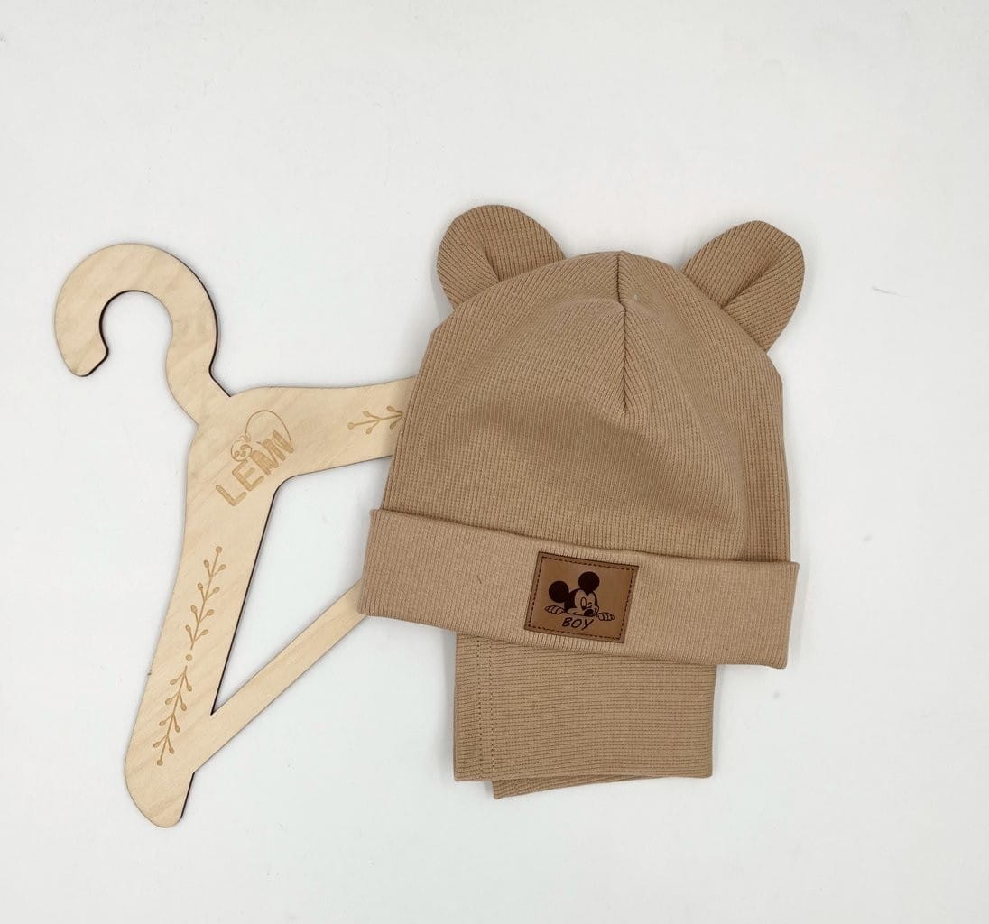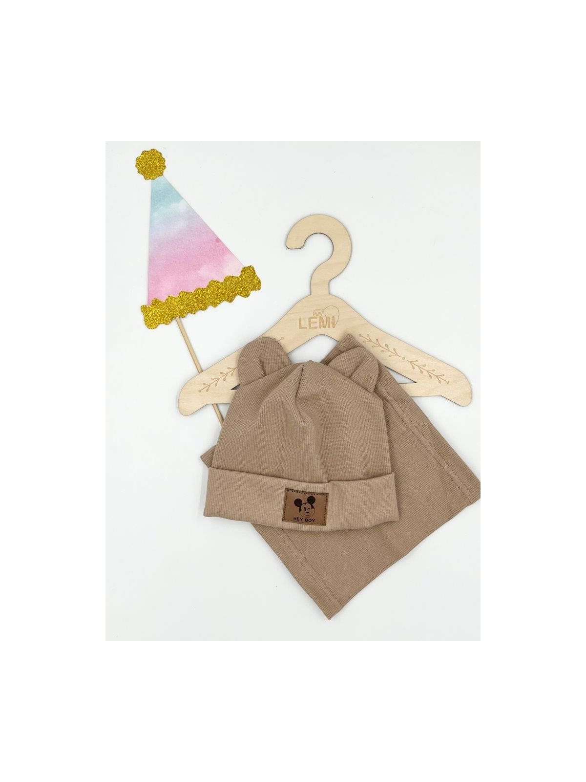 Komplet chłopięcy – czapka i komin USZKI TK dla dzieci. Polska produkcja, pojedynczy materiał bawełniany (95% bawełna, 5% elastan), wywijana czapka z uszkami, ozdobna naszywka ze skóry ekologicznej, idealny na jesień.