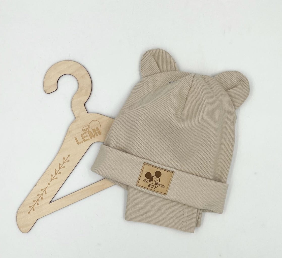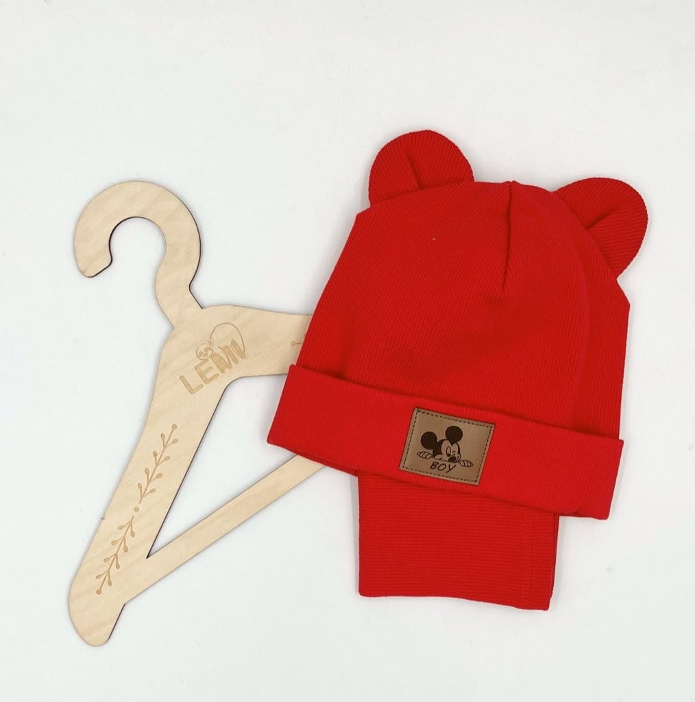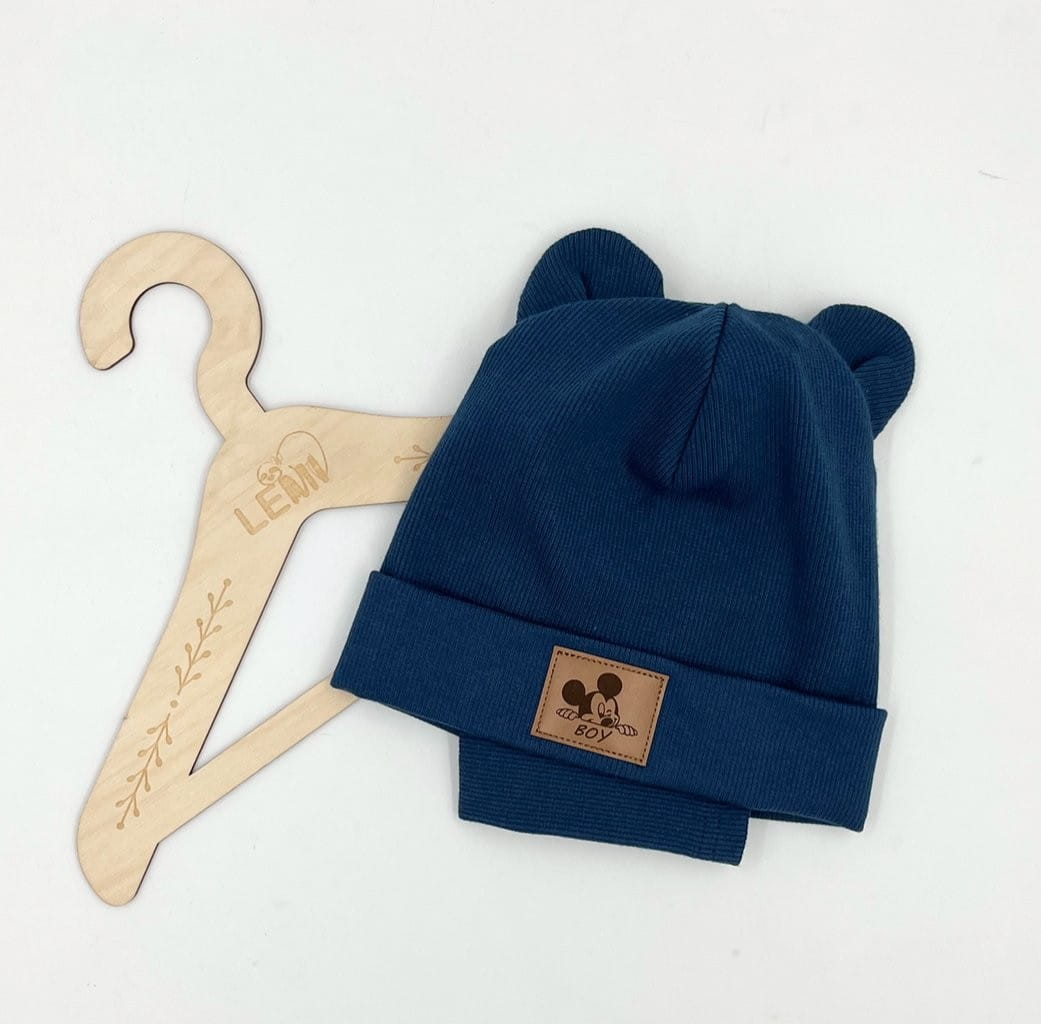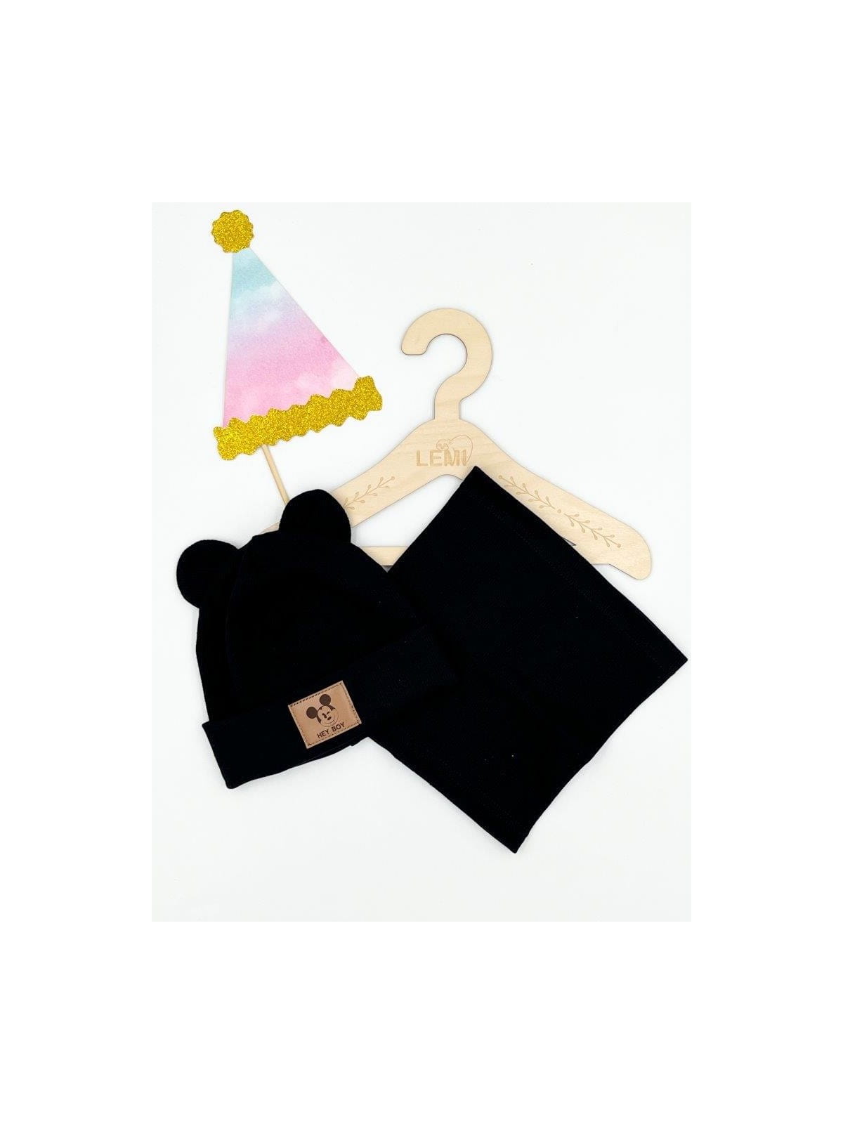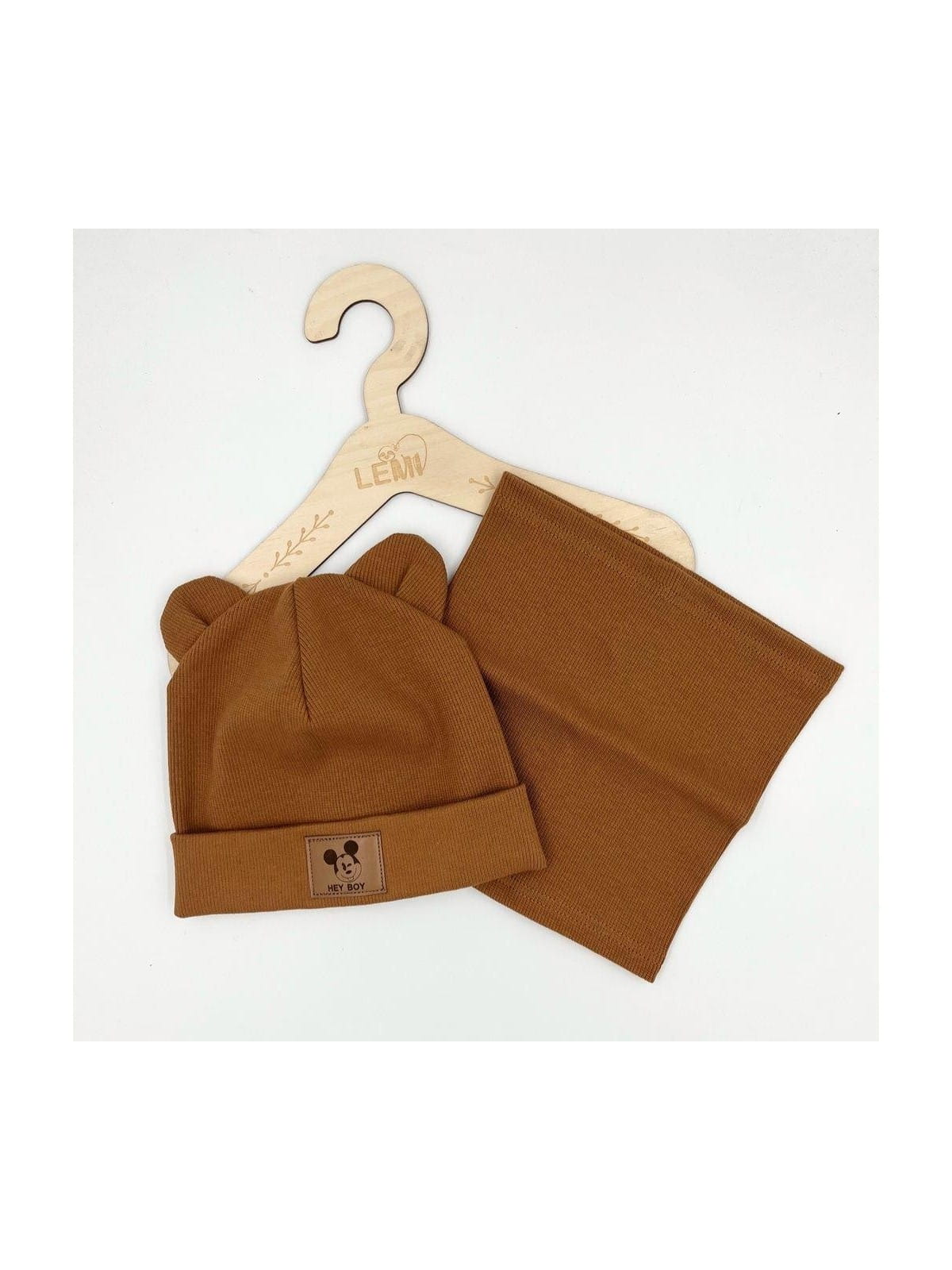 Komplet chłopięcy – czapka i komin USZKI TK dla dzieci. Polska produkcja, pojedynczy materiał bawełniany (95% bawełna, 5% elastan), wywijana czapka z uszkami, ozdobna naszywka ze skóry ekologicznej, idealny na jesień.