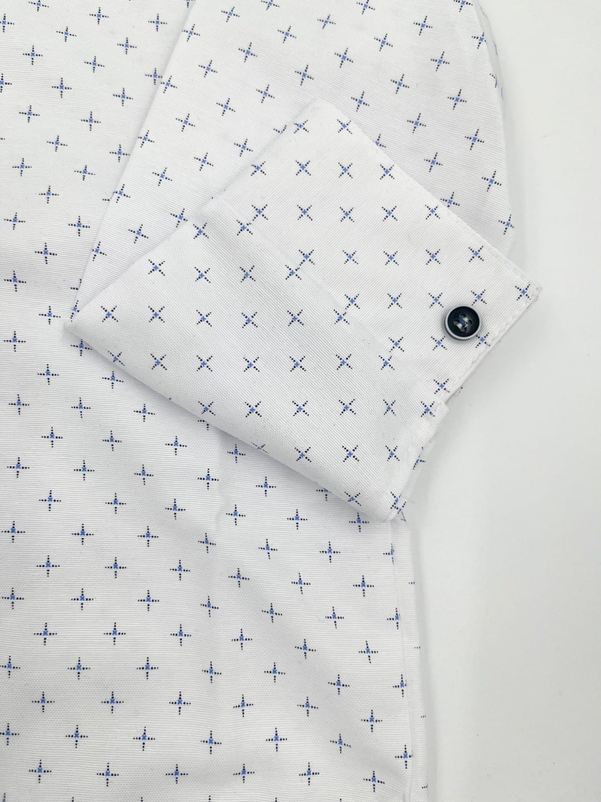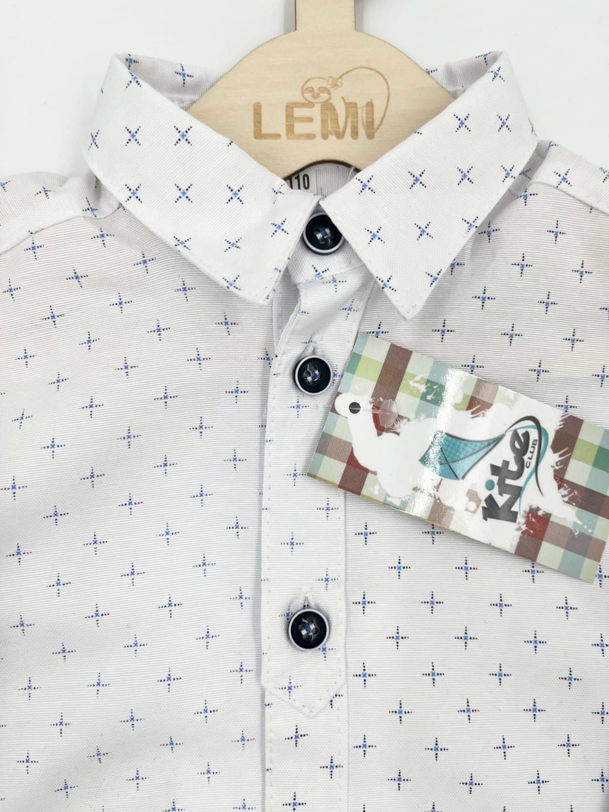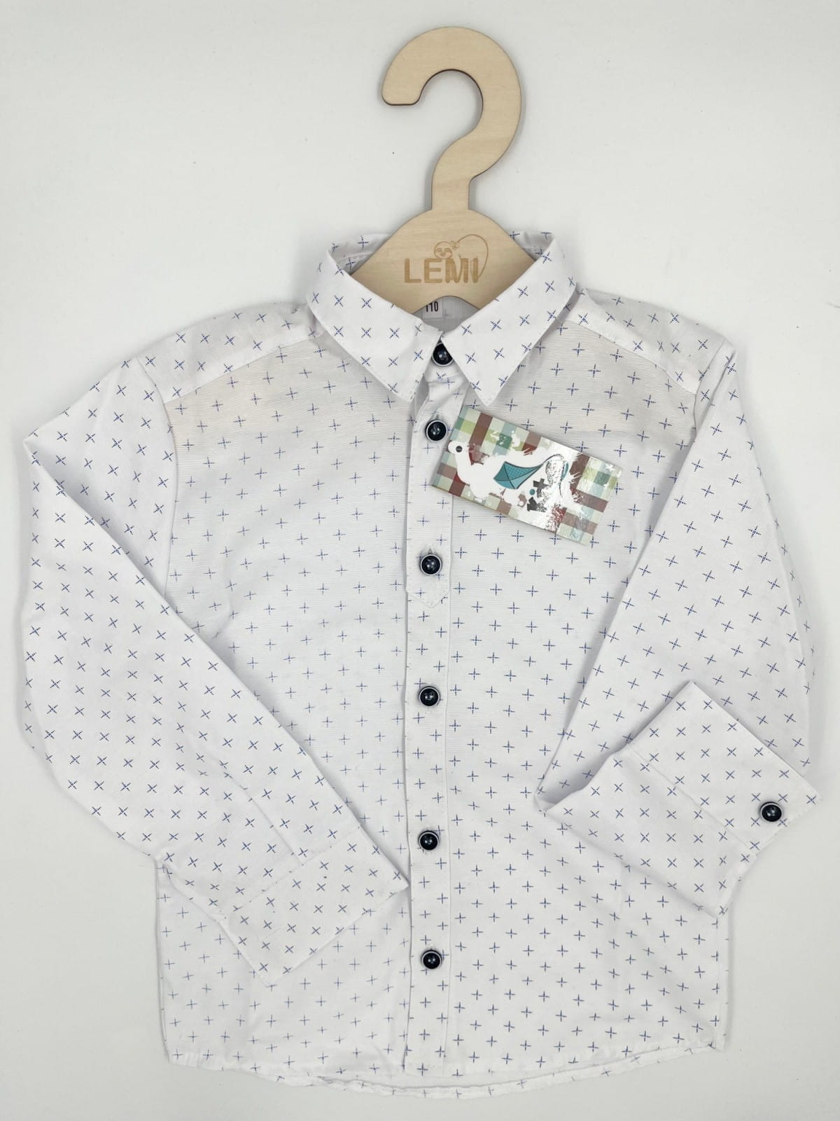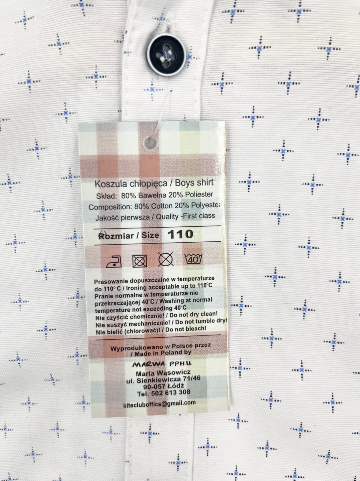 Elegancka biała koszula chłopięca w delikatny granatowy wzorek, wykonana w Polsce z wysokiej jakości tkaniny (70% bawełny). Klasyczny kołnierzyk i granatowe guziczki z białą obwódką nadają jej stylowego wyglądu. Idealna na apele, uroczystości szkolne, święta i inne wyjątkowe okazje.