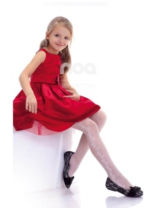 Dziewczęce rajstopy wzorzyste. Wzór, który biegnie na boku nogi uszlachetniony został srebrna nitką. Rajstopy te są idealnym dopełnieniem sukienek komunijnych jak również strojów wizytowych. Wykonane z przędzy typu elastan. Przezroczyste, półmatowe. Mogą stanowić piękne dopełnienie stroju komunijnego lub innego wizytowego.