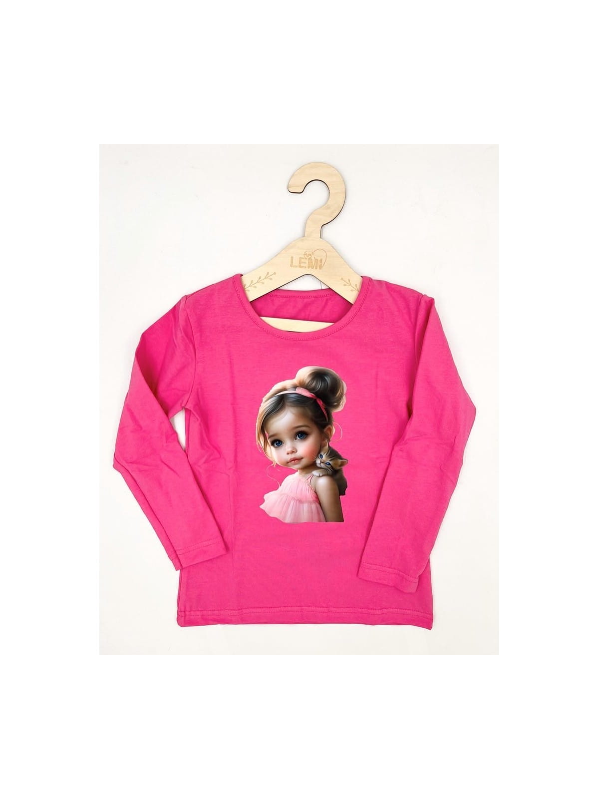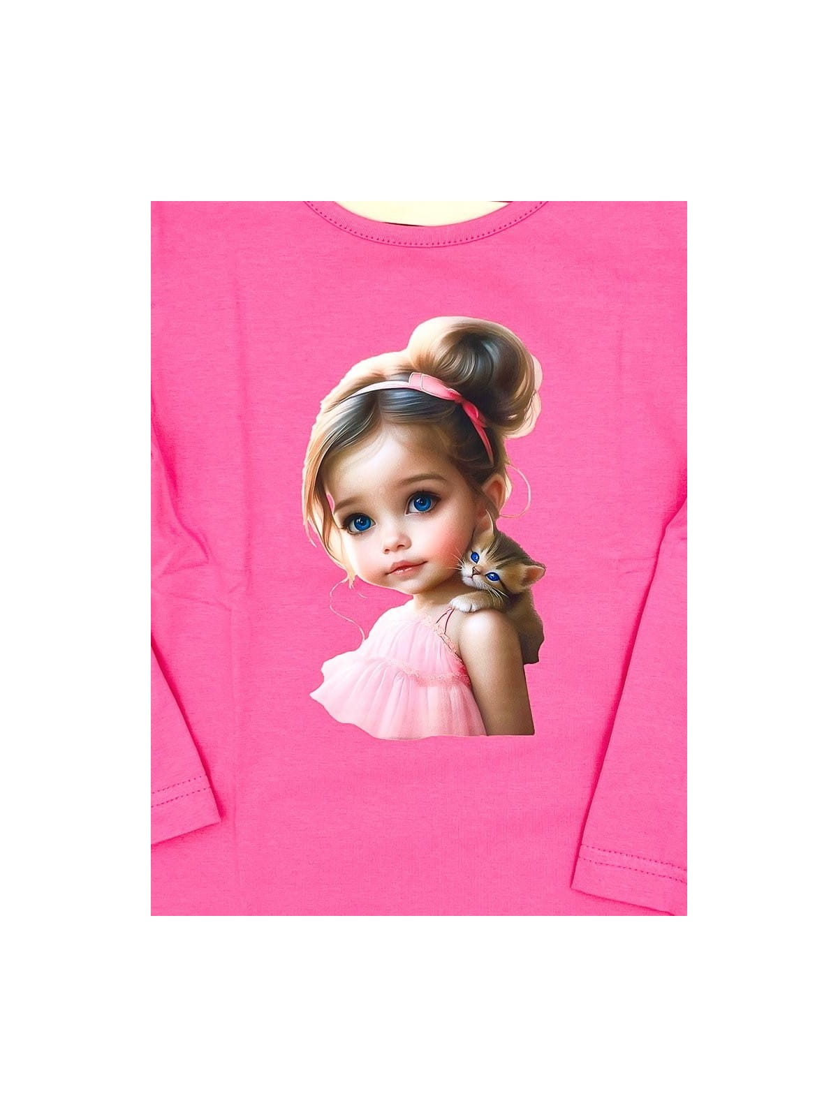 Na froncie bluzki znajduje się uroczy nadruk przedstawiający dziewczynkę z kotkiem. Dziewczynka jest radosna, z delikatnym uśmiechem na twarzy, ubrana w różowy strój, a jej włosy są ozdobione kokardkami. Kot z niebieskimi oczami, siedzi na rękach dziewczynki, tworząc ciepły, przyjazny obrazek. Całość ma radosny, przytulny charakter, który przypadnie do gustu każdemu maluchowi.