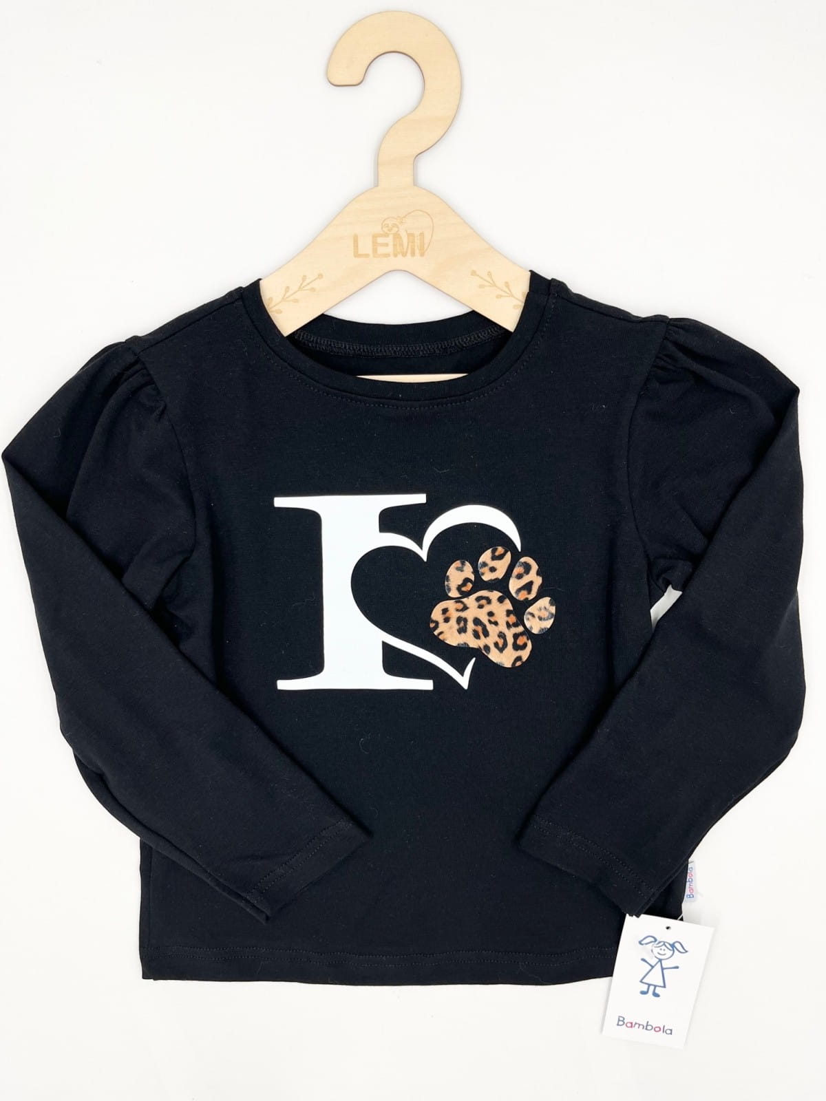 Bluzka ma klasyczny krój z okrągłym dekoltem i długimi rękawami marszczonymi na ramionach, co sprawia, że pasuje do różnych okazji i sezonów. Motyw panterki to łapka kociaka umieszczona w białym serduszku. Czarne tło podkreśla intensywność wzoru, tworząc kontrastowy efekt.