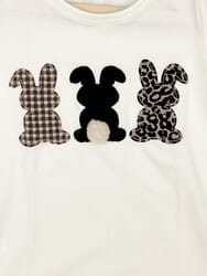 Przednia część bluzki zdobiona jest uroczymi króliczkami, które zostały wykonane z różnych materiałów – od miękkich tkanin po zróżnicowane faktury, co dodaje projektowi głębi i interesującego charakteru. Dodatkowym urokiem są małe, miękkie pompony, które wspaniale dopełniają całość, nadając bluzce wyjątkowego, bajkowego wyglądu.