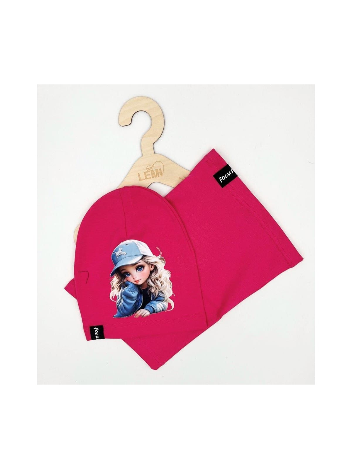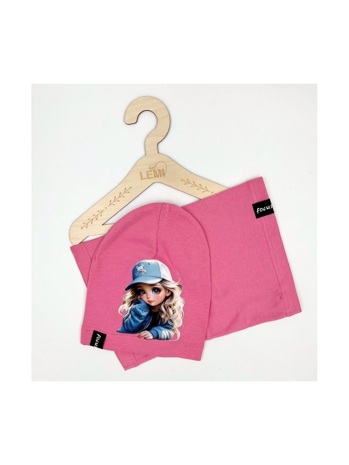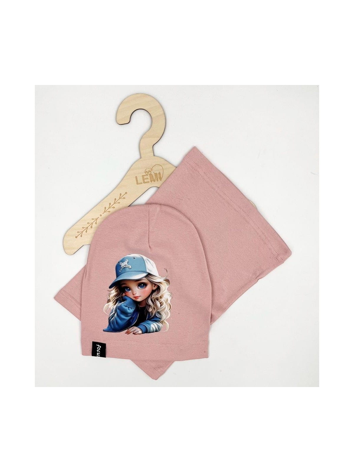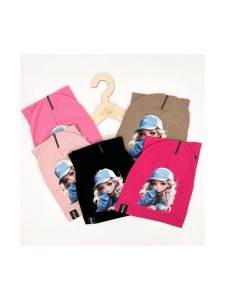 Praktyczny i wygodny komplet dla dziewczynki, składający się z czapki i komina, wykonany z wysokiej jakości bawełny z dodatkiem elastanu, zapewniającej komfort i trwałość. Idealny na chłodniejsze dni, spacery i zabawy na świeżym powietrzu.