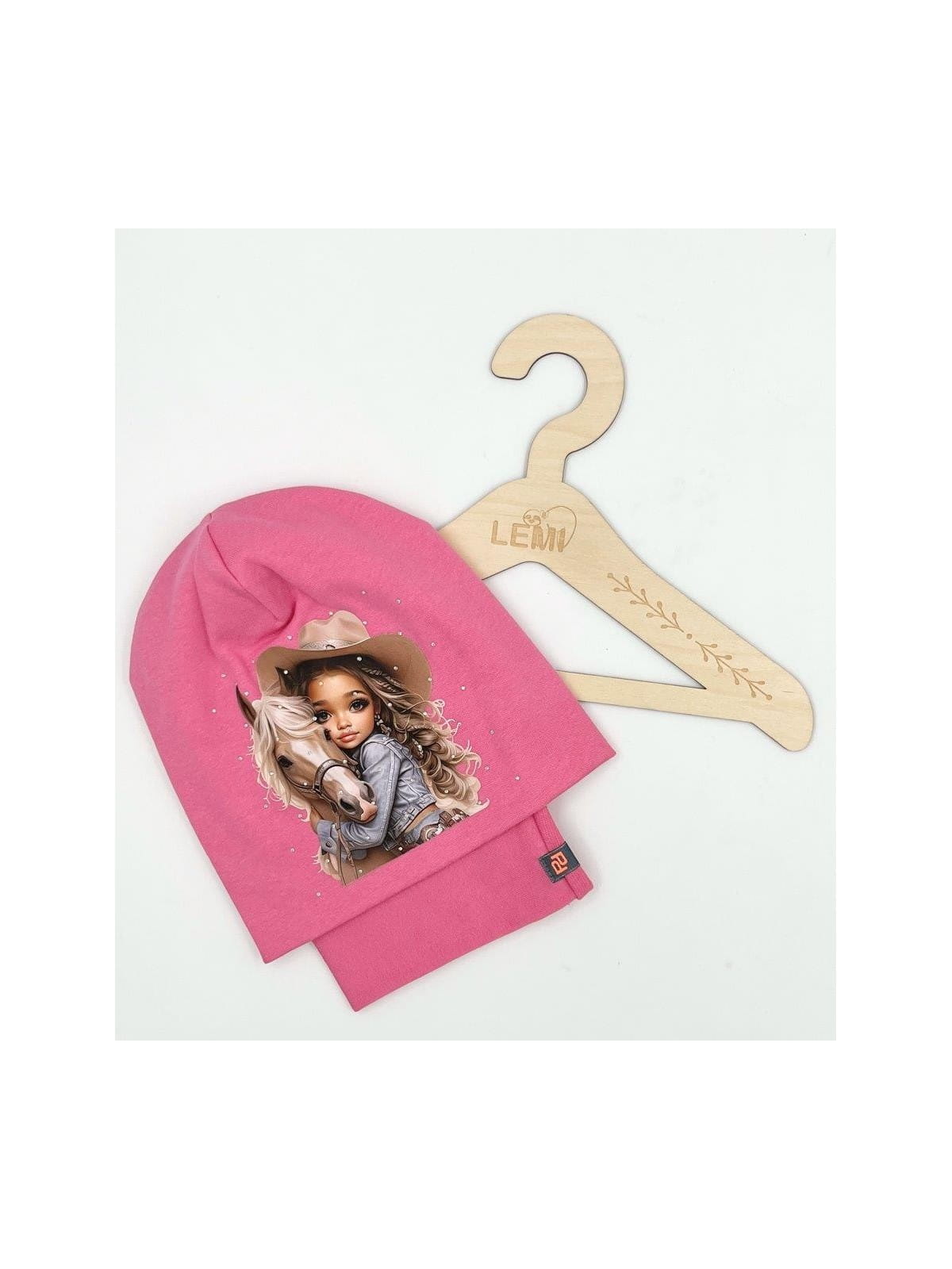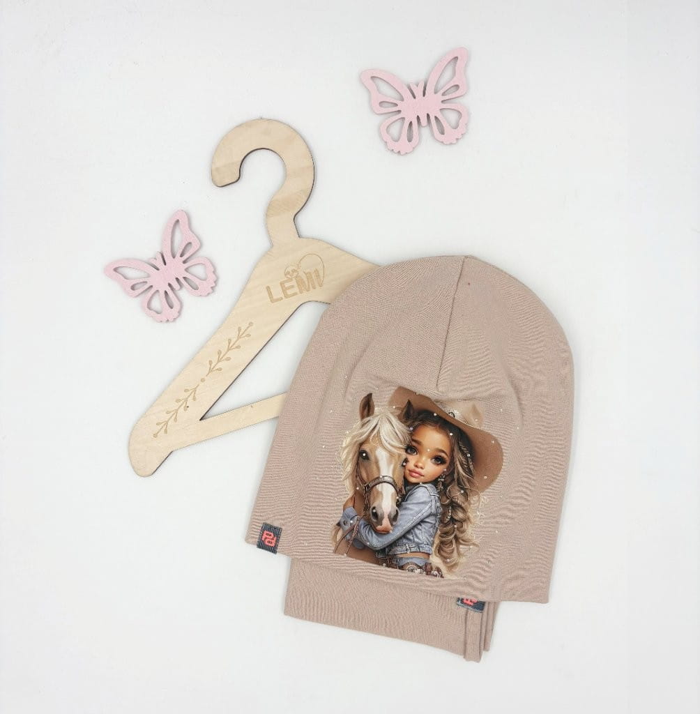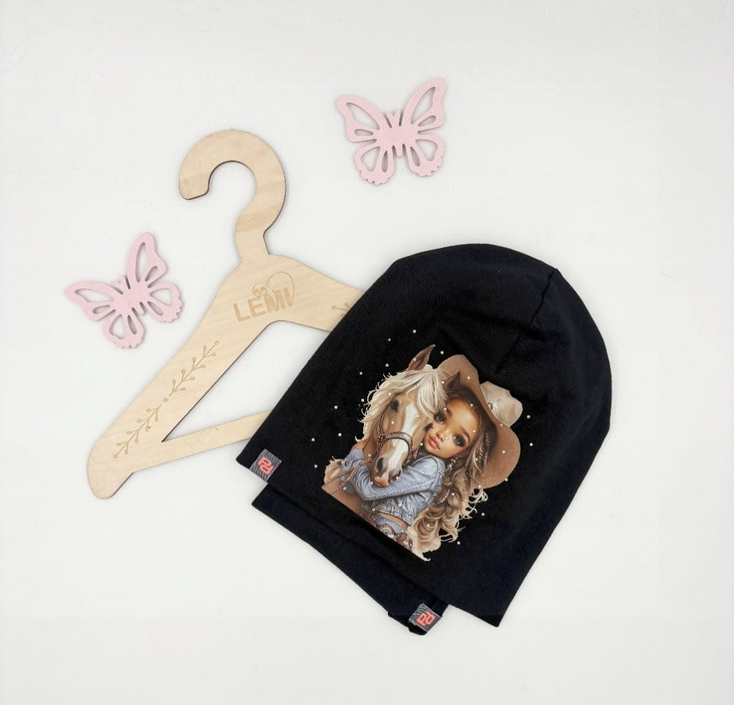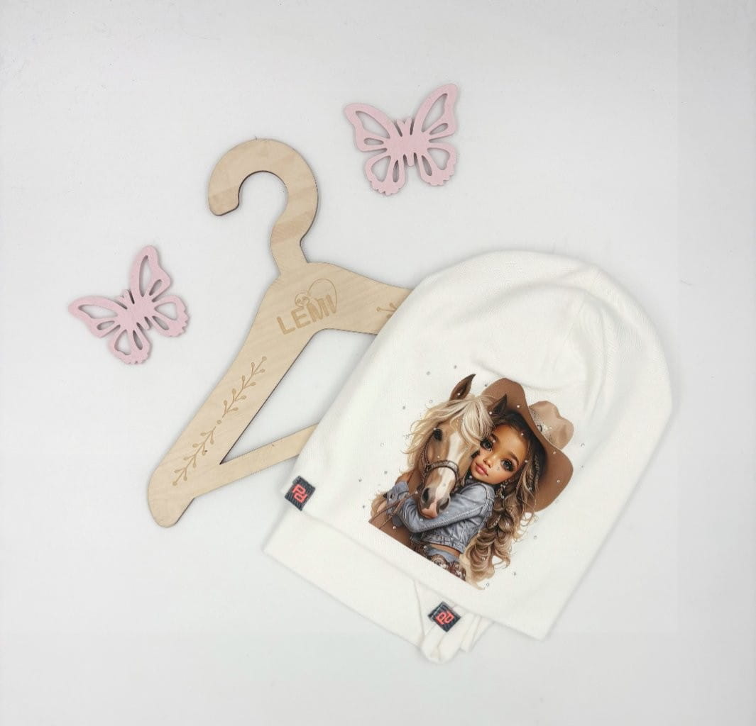 Bawełniany komplet dla dziewczynki – czapka z nadrukiem dziewczynki z koniem i dżetami