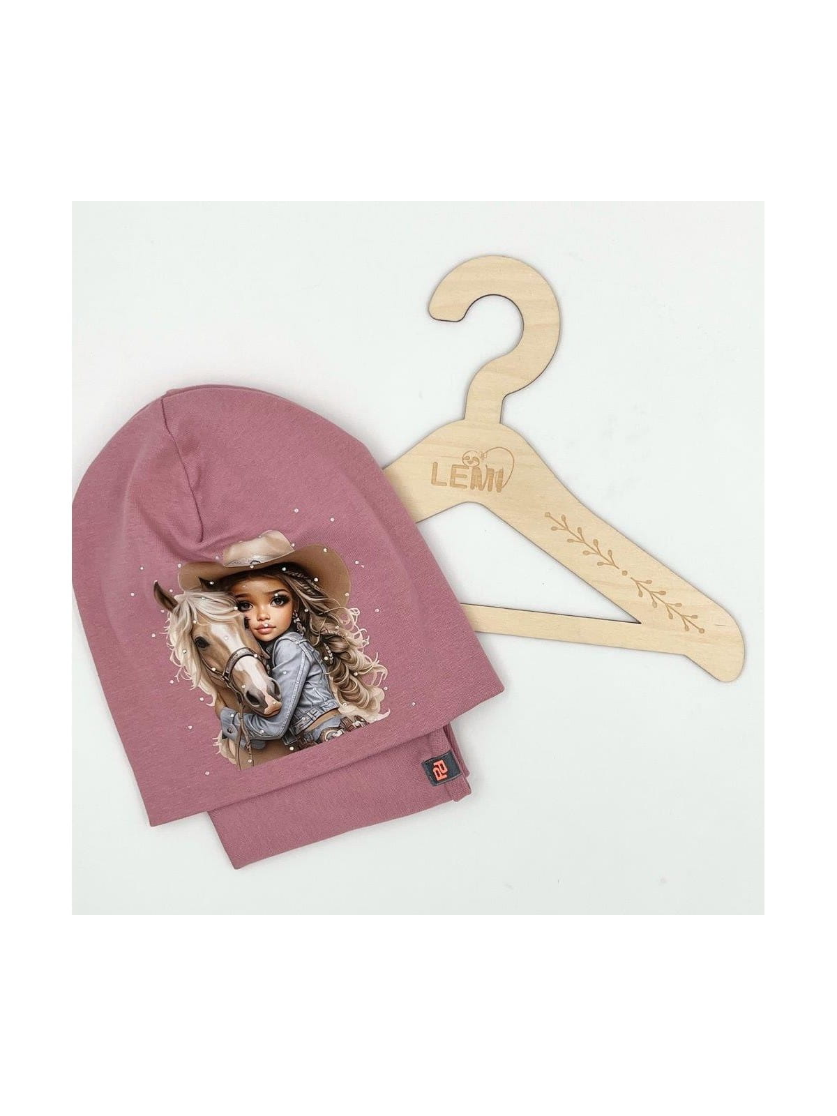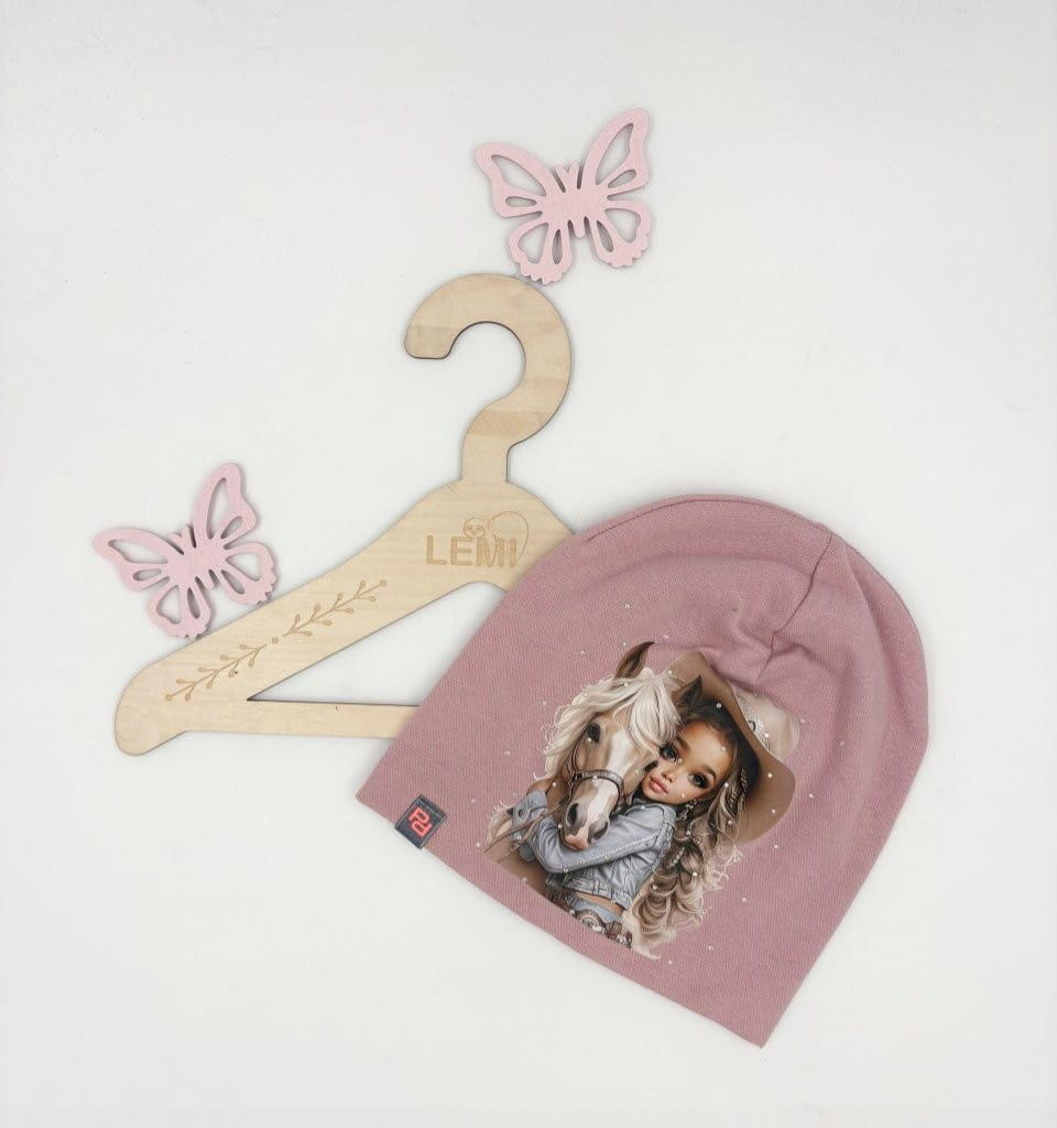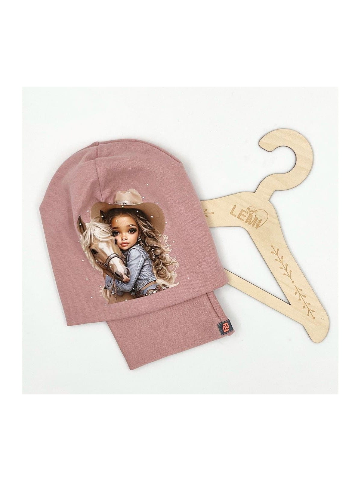 Bawełniany komplet dla dziewczynki – czapka z nadrukiem dziewczynki z koniem i dżetami