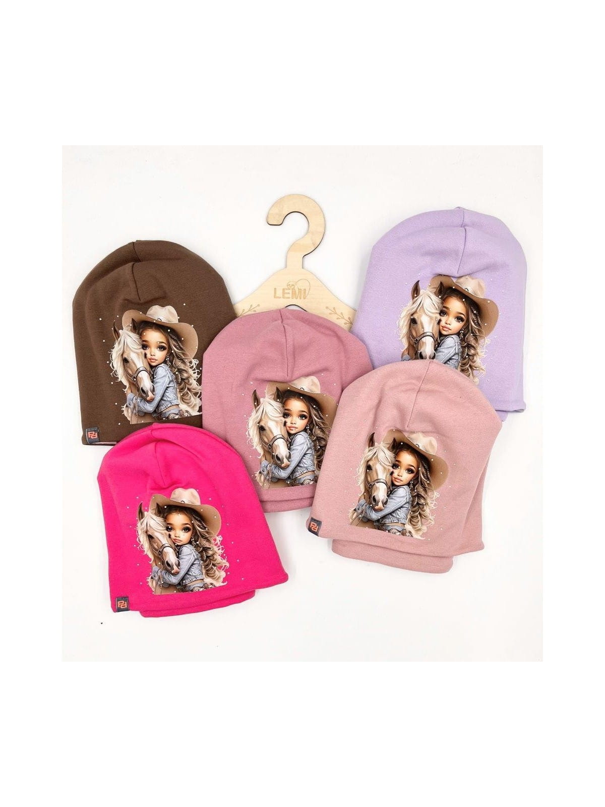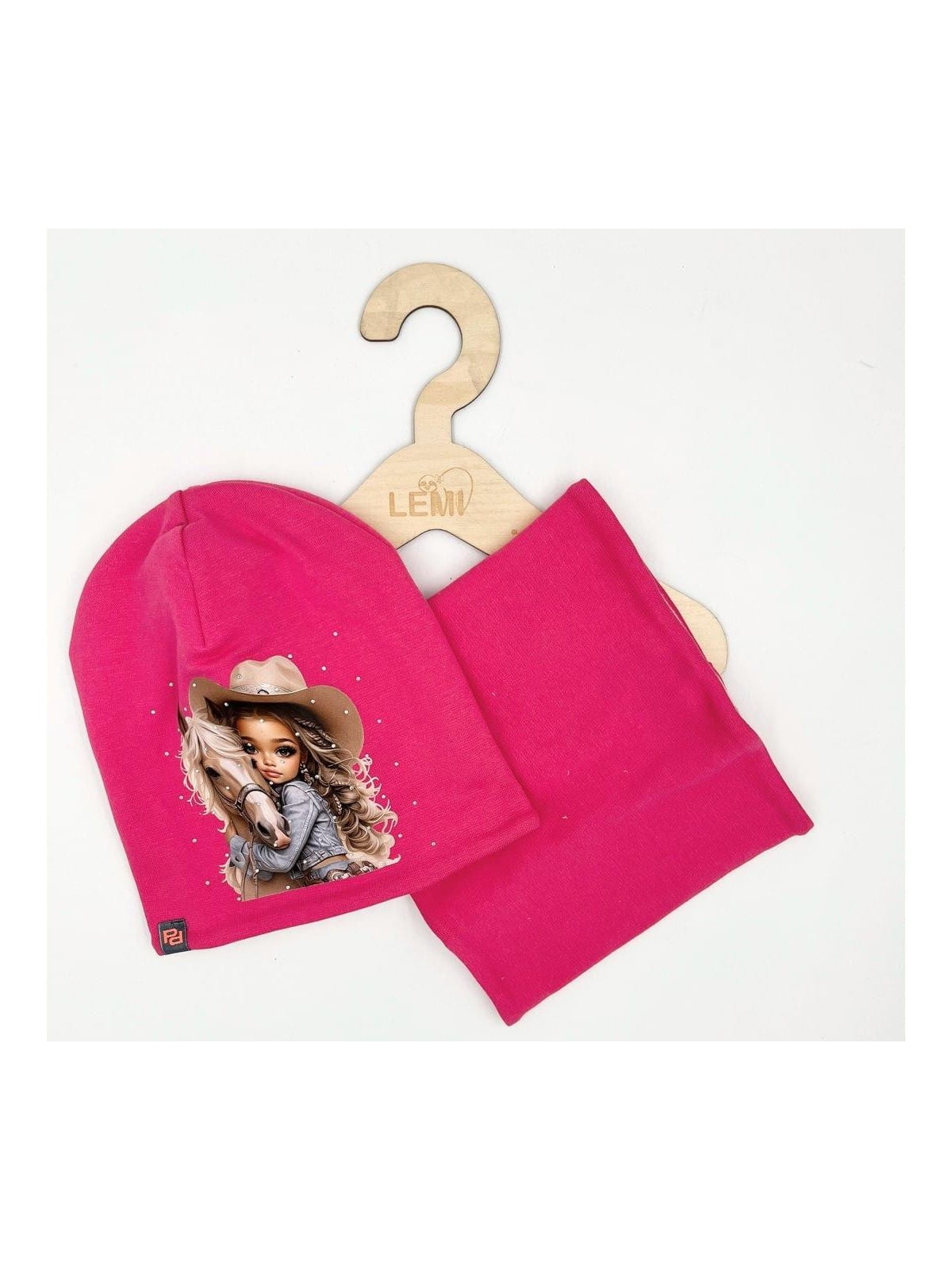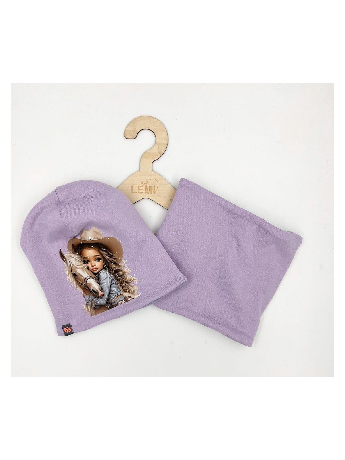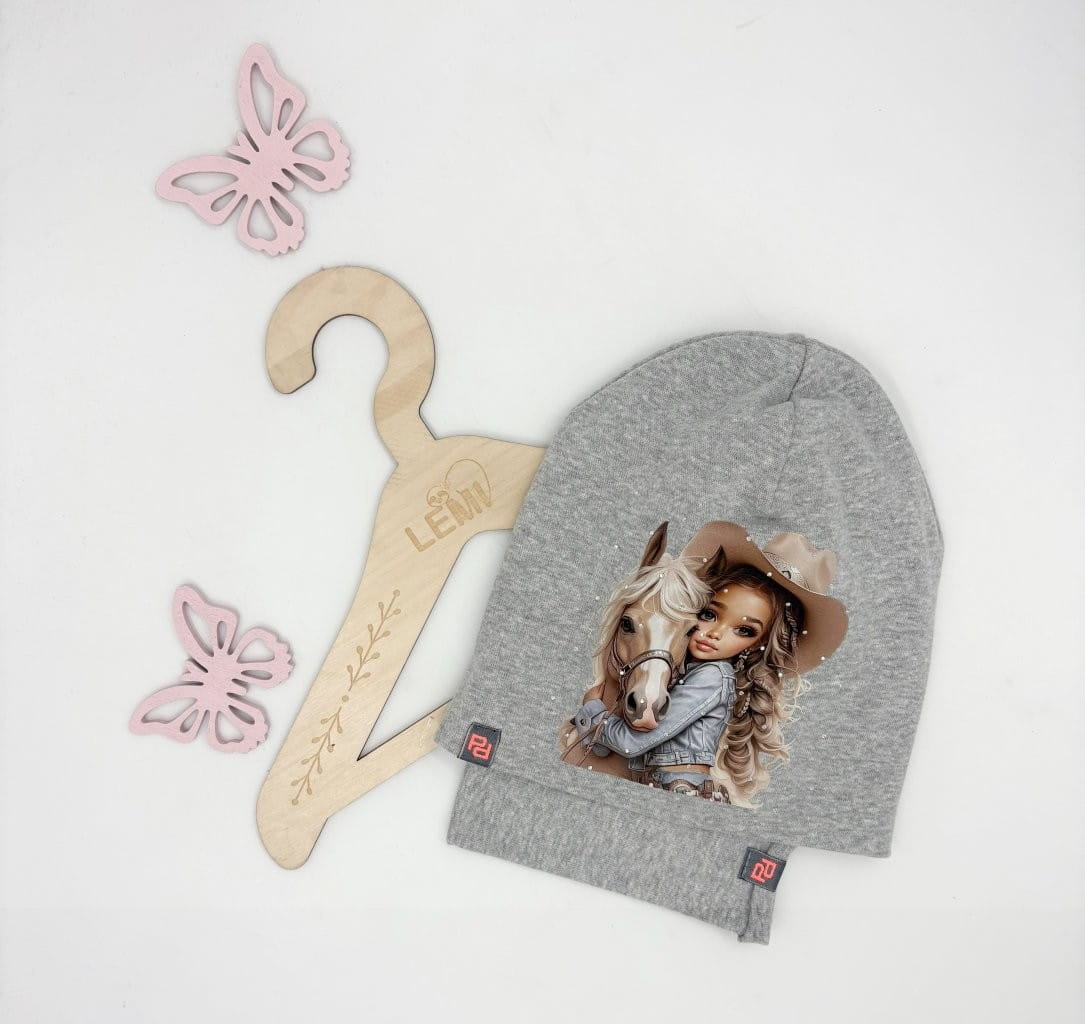 Bawełniany komplet dla dziewczynki – czapka z nadrukiem dziewczynki z koniem i dżetami