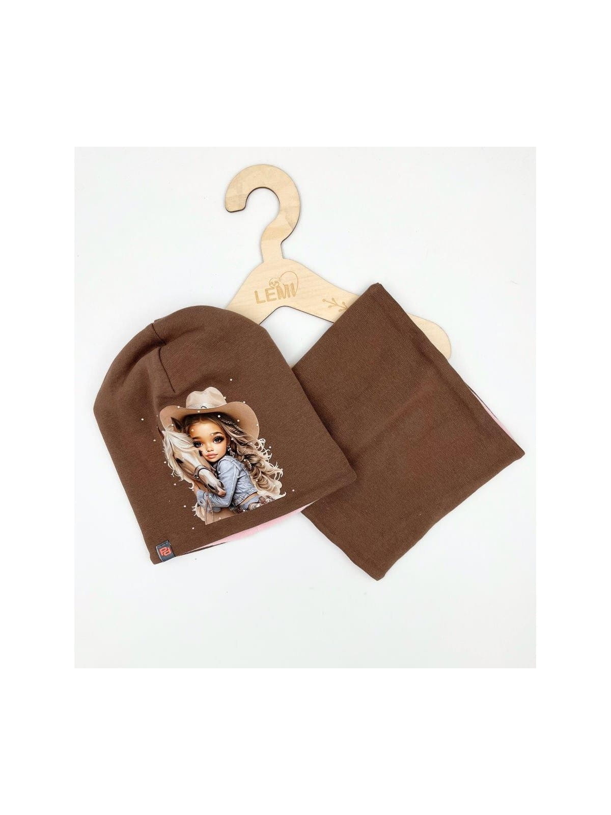 Bawełniany komplet dla dziewczynki polskiej produkcji. Czapka z podwójnej dzianiny (95% bawełna, 5% elastan) ozdobiona nadrukiem dziewczynki z koniem i dżetami. Wymiary 19x21 cm, odpowiednia dla dzieci w wieku 3–8 lat.