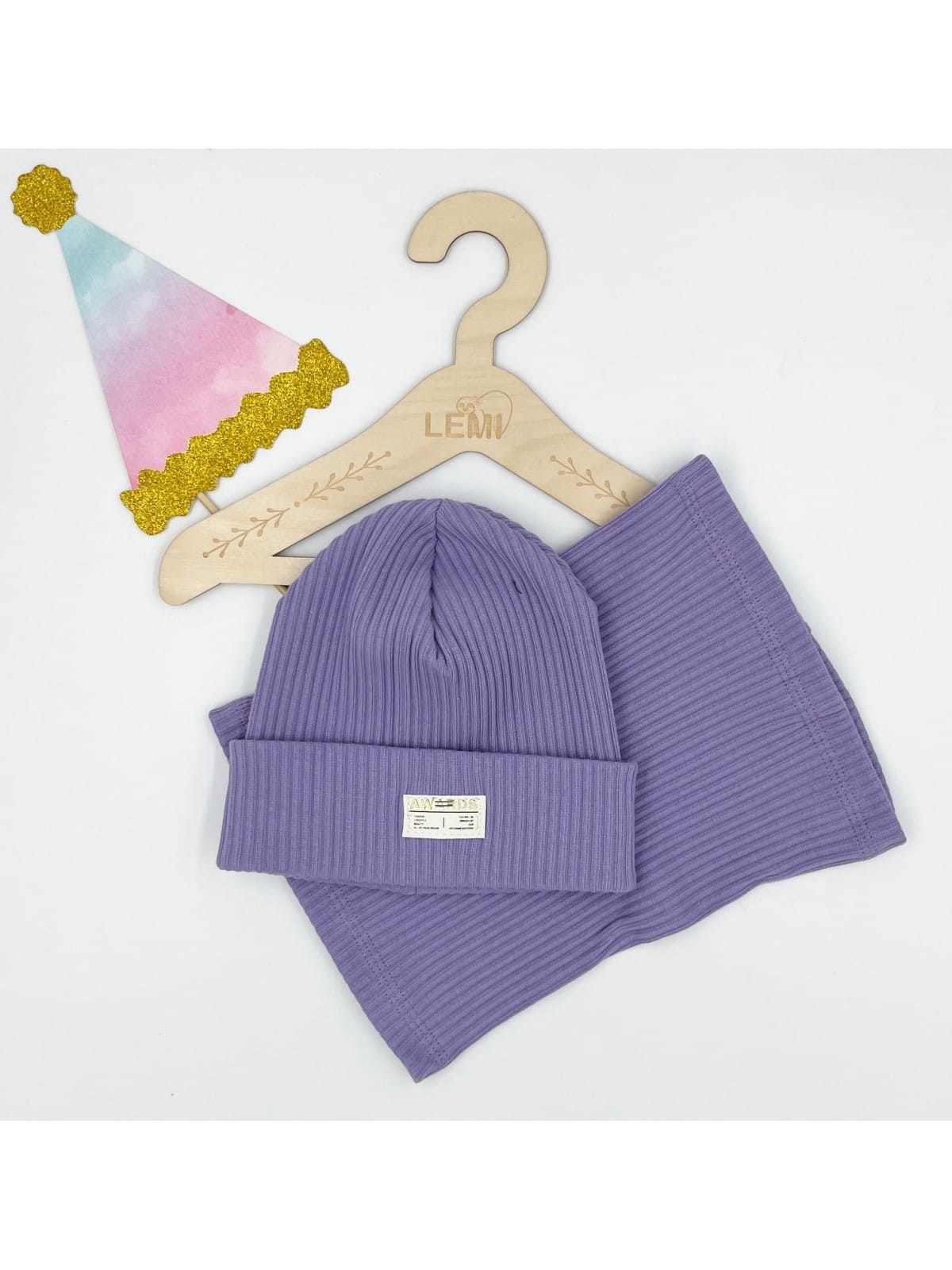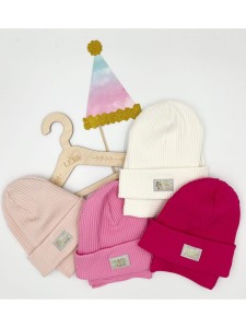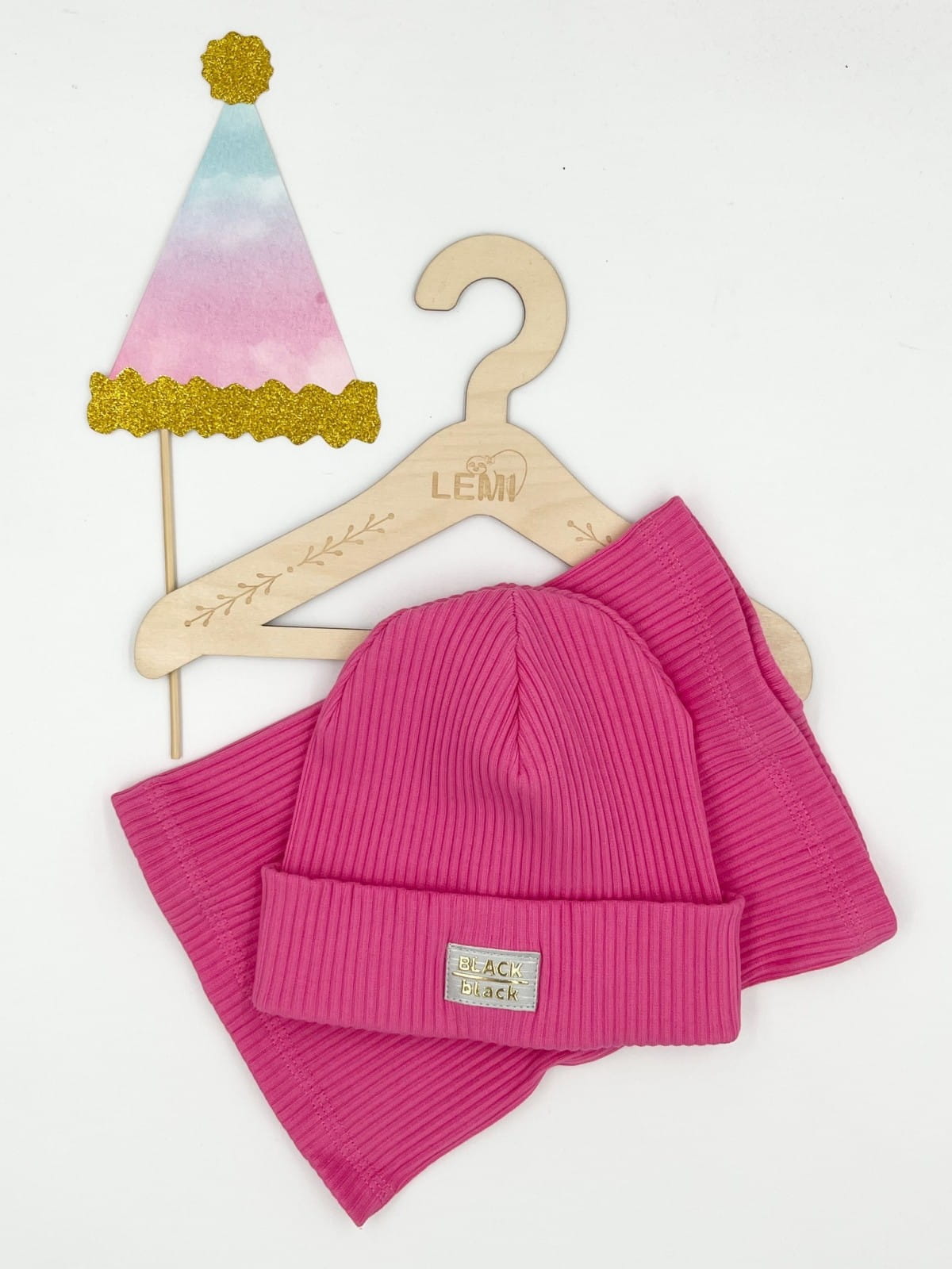 Stylowy i wygodny komplet jesienny dla dziewczynki, składający się z czapki i komina w prążkowanym wzorze. Czapka wykonana z pojedynczego materiału, lekka i miękka, z możliwością wywinięcia brzegów dla dodatkowego komfortu. Na przodzie czapki znajduje się delikatna naszywka, dodająca uroku i subtelnego charakteru.