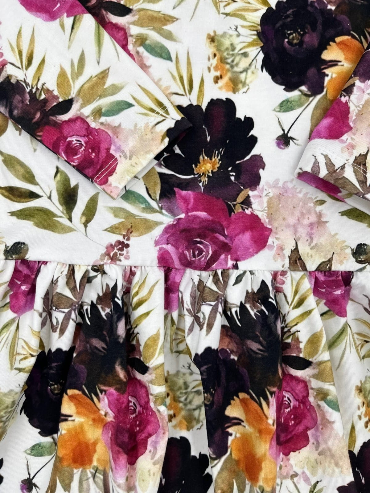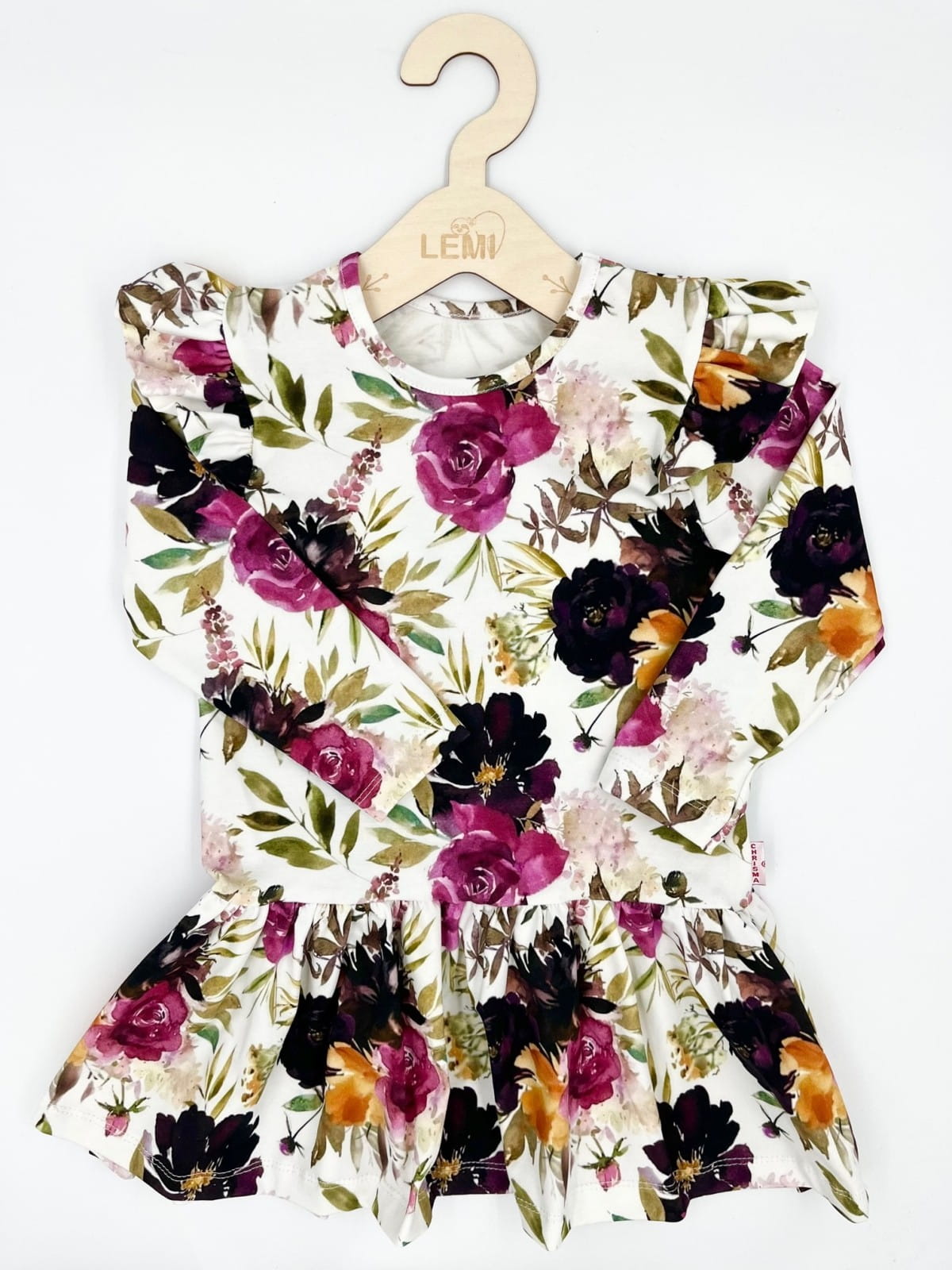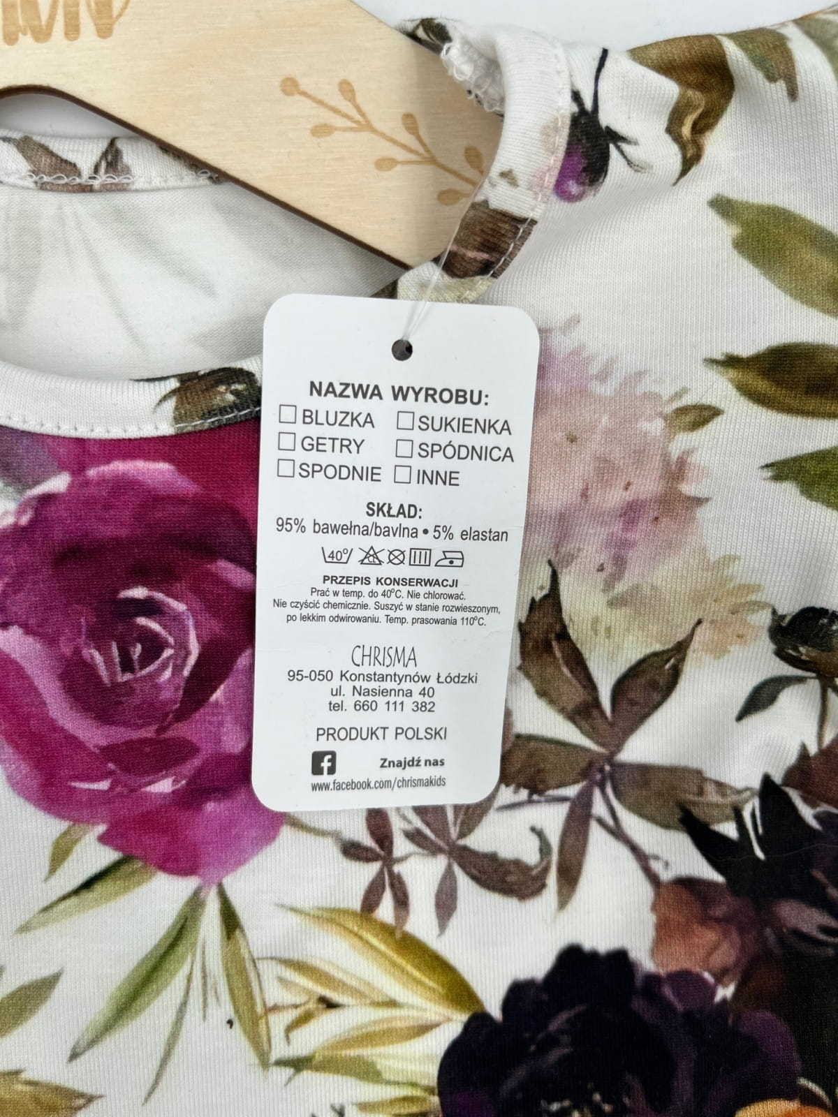 Kolorowa sukienka bawełniana dla dziewczynki Chrisma – polska produkcja, trwały cyfrowy nadruk kwiatów, falbanki na ramionkach, lekko rozszerzany dół, 95% bawełna, 5% elastan.