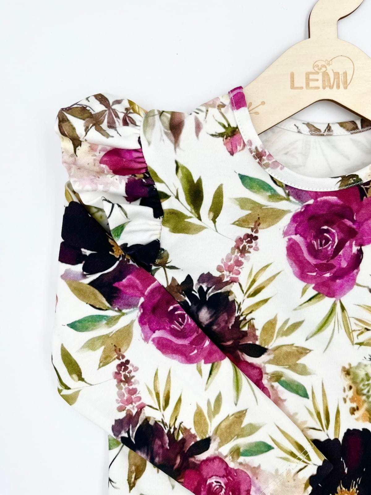 Sukienka przyciąga wzrok dzięki trwałemu, cyfrowemu nadrukowi kwiatów, który zachowuje intensywne kolory nawet po wielu praniach. Na ramionkach znajdują się charakterystyczne falbanki, dodające dziewczęcego uroku, a lekko rozszerzany dół nadaje sukience eleganckiego, zwiewnego fasonu.