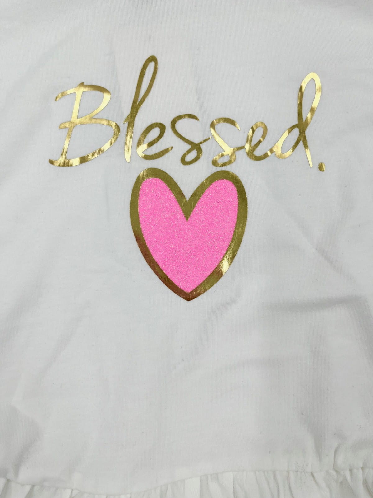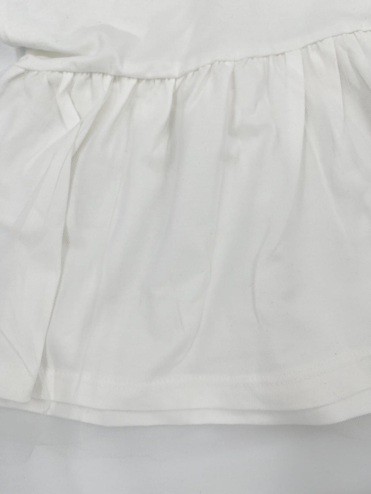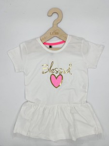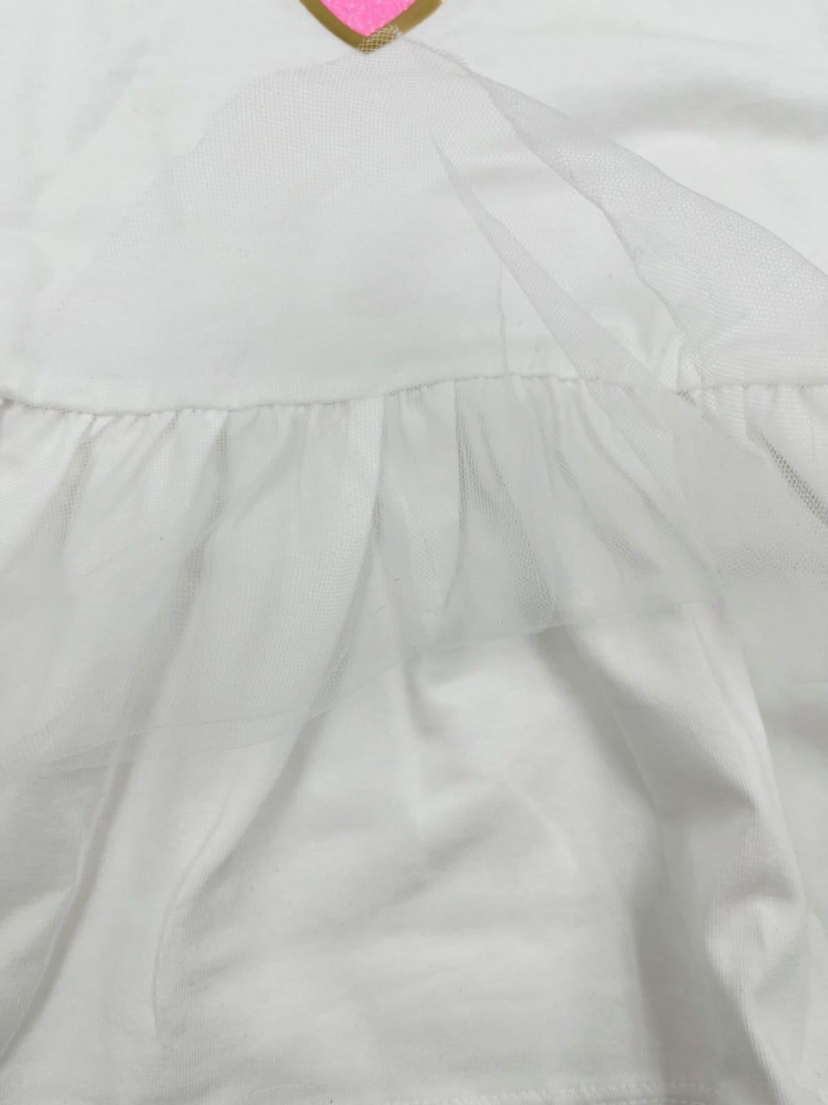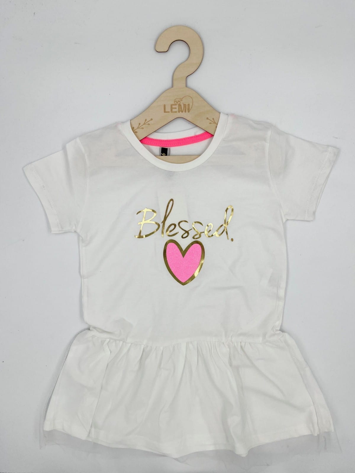 Bawełniana sukienka na lato w kolorze ecru. Na środku piękne różowe serduszko ze złotym napisem. Dół sukienki to bawełniana falbanka, a na niej delikatny tiul- miekki i miły w dotyku. 95% bawełna, 5% elastan- najlepszy skład materiału.