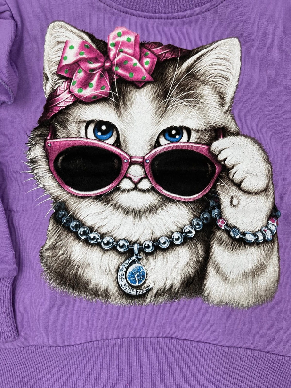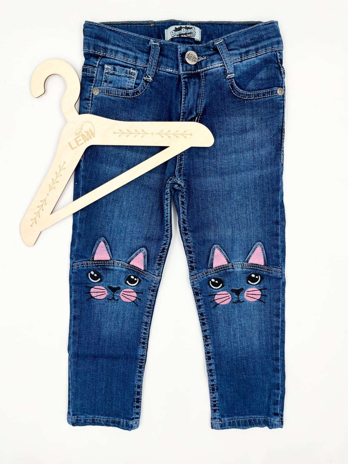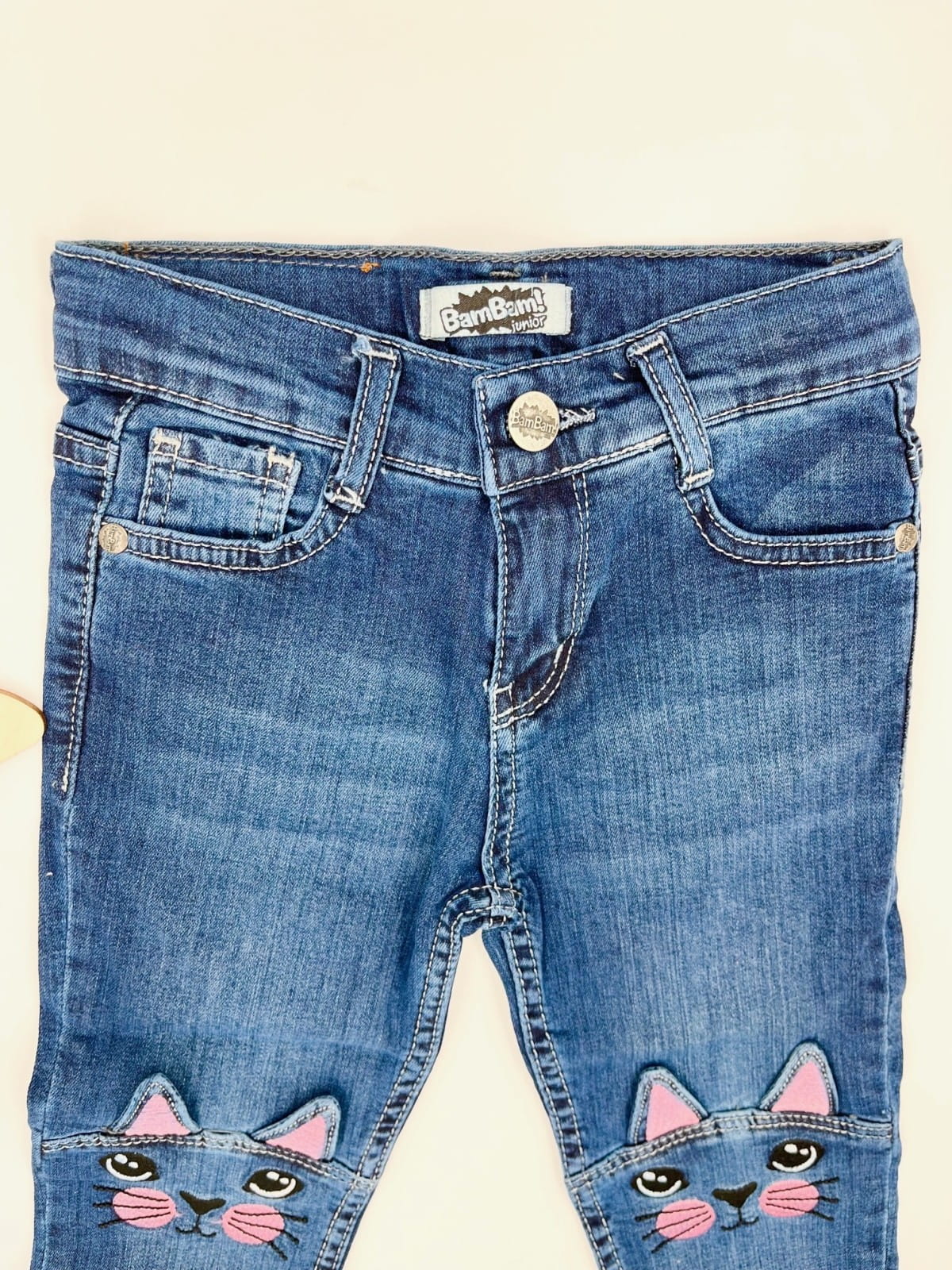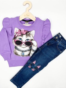 Komplecik tureckiej firmy Bam Bam. Jakość bawełny Premium. Bluza z kotkiem, na ramionach ozdobne falbanki, na dole bluzy i na końcu rękawów ściągacze. W komplecie spodnie dżinsowe regulowane w pasie. Na kolankach kotki nawiązujące do bluzy. Bardzo miękki dżins. Można nosić jako komplet lub w innych zestawach.