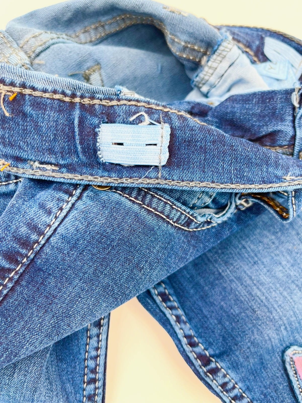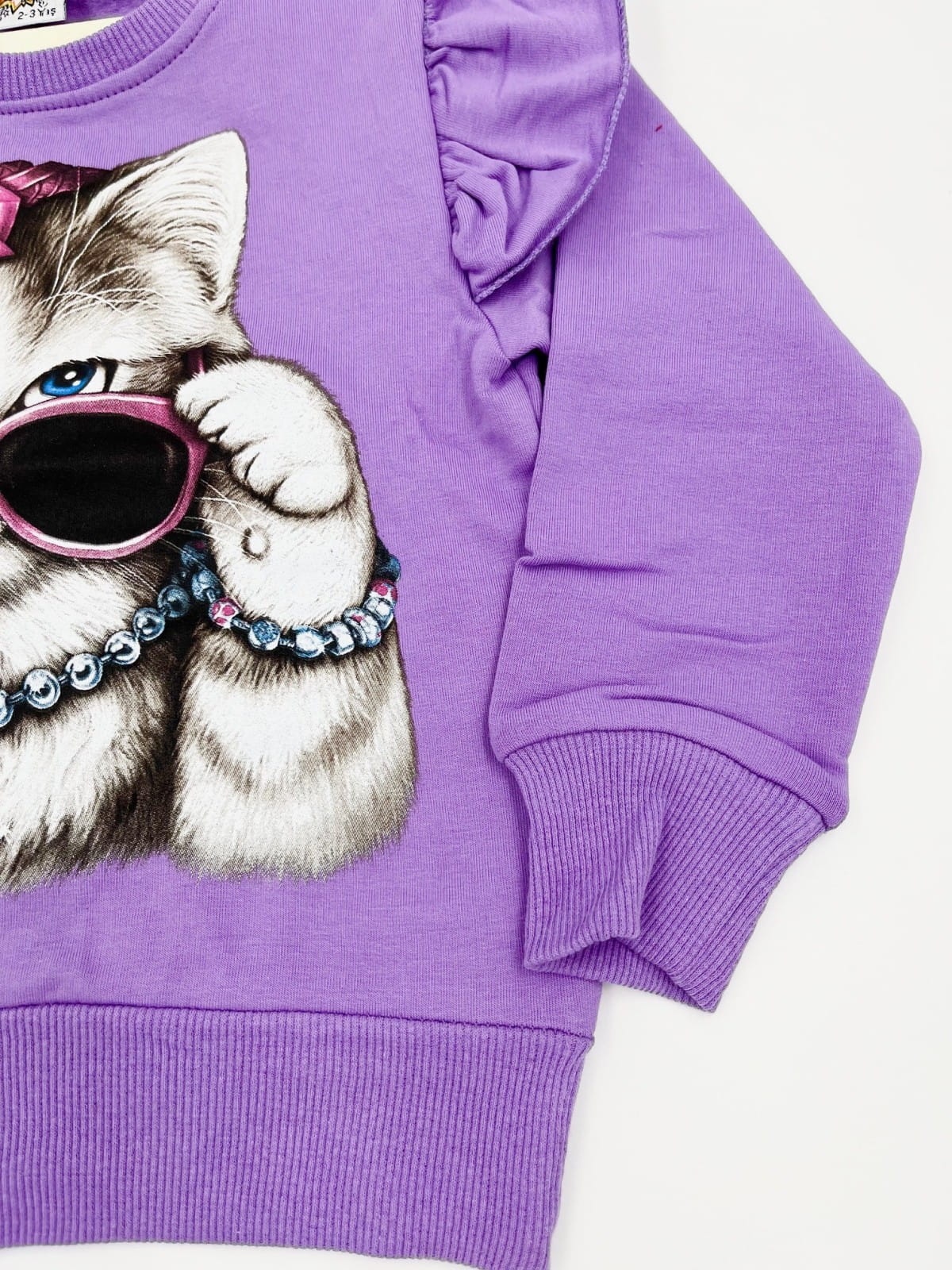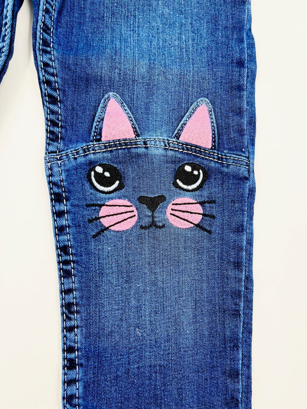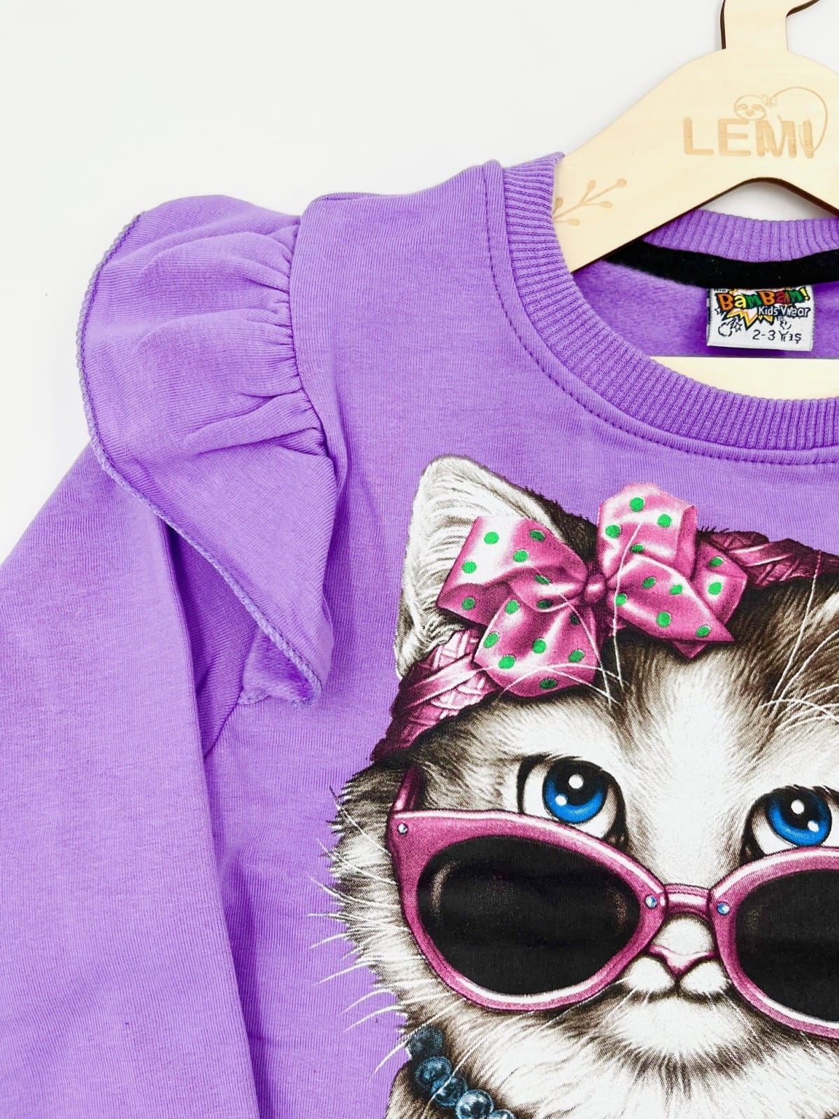 Komplecik tureckiej firmy Bam Bam. Jakość bawełny Premium. Bluza z kotkiem, na ramionach ozdobne falbanki, na dole bluzy i na końcu rękawów ściągacze. W komplecie spodnie dżinsowe regulowane w pasie. Na kolankach kotki nawiązujące do bluzy. Bardzo miękki dżins. Można nosić jako komplet lub w innych zestawach.