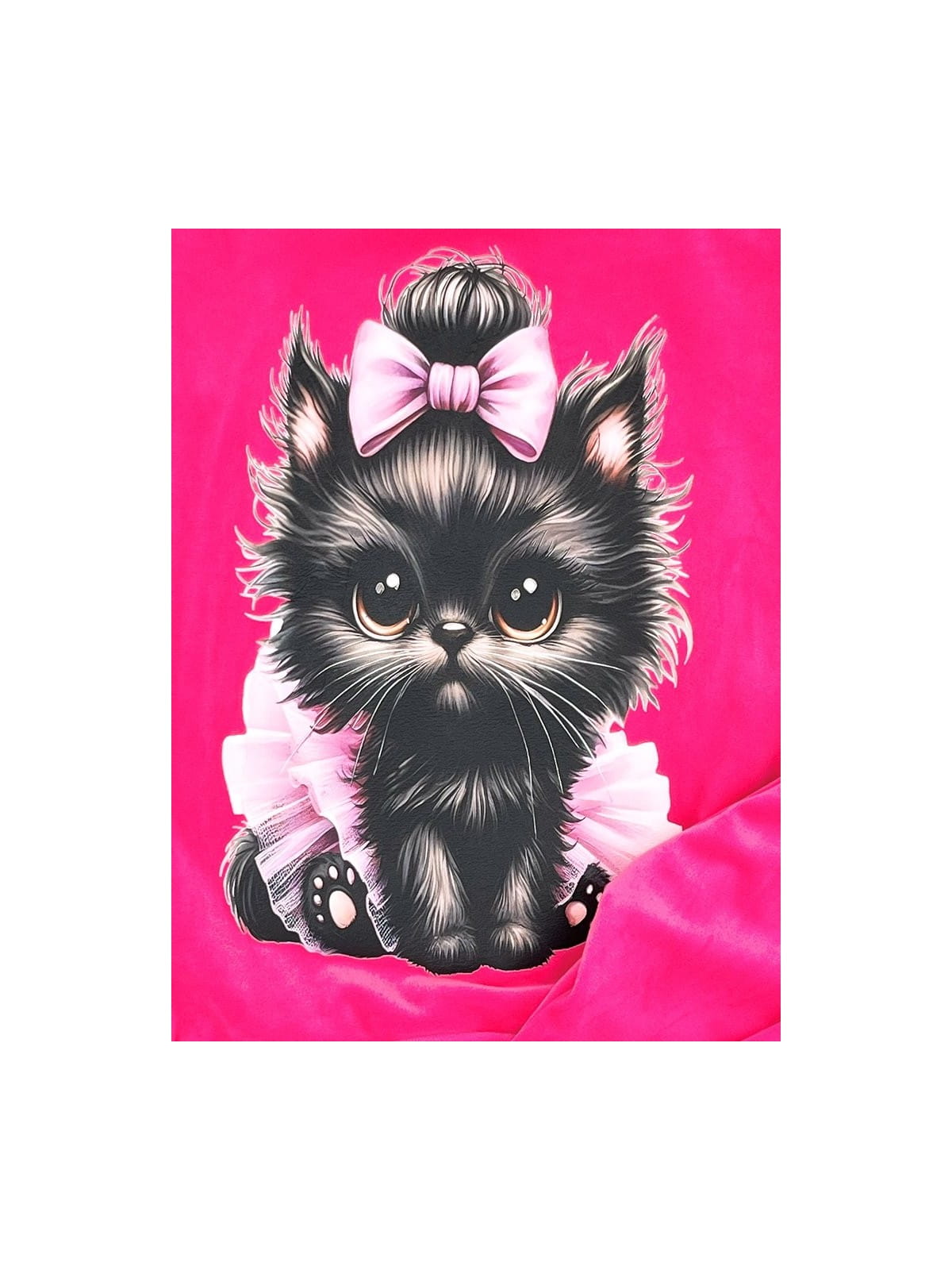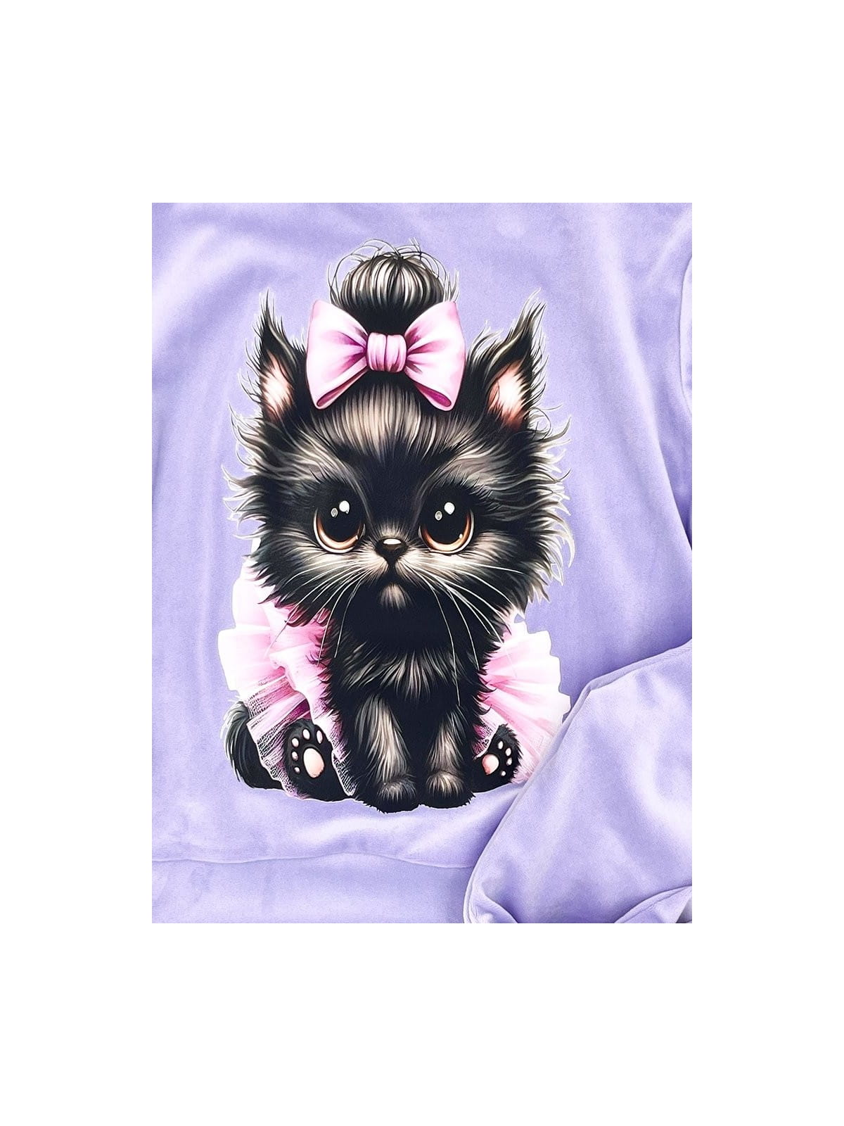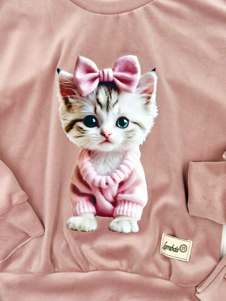 Bluza wykonana jest z miękkiego, przyjemnego w dotyku weluru, co zapewnia ciepło i komfort noszenia. Na przodzie znajduje się uroczy nadruk z kotem, który dodaje dresowi słodkiego charakteru i z pewnością przypadnie do gustu każdej dziewczynce.