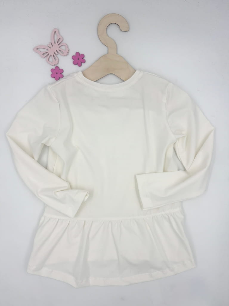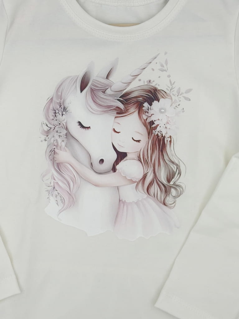 Dziewczęca bluzka z długim rękawem Aipi – miękka i lekko dopasowująca, wykonana z 95% bawełny. Na przodzie nadruk dziewczynki tulącej jednorożca z naszytą perełką. Tył delikatnie zmarszczony i przedłużony. Nie rozciąga się ani nie deformuje; pranie na lewej stronie chroni nadruk. Idealna na co dzień i wyjątkowe okazje.