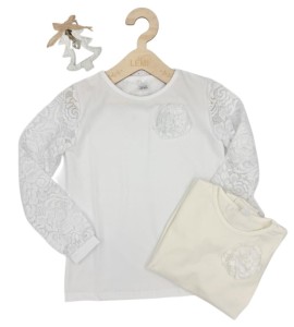 Bluzka posiada długi rękaw wykonany z miękkiej, delikatnej koroneczki, która nie drapie i jest przyjemna w dotyku. Rękaw wykończony jest ściągaczem, a dekolt starannie obszyty, co nadaje bluzce elegancki i schludny wygląd. Ozdobą bluzki jest kwiat wykonany z tego samego materiału co rękaw, dodający subtelnego uroku i wyjątkowego charakteru.