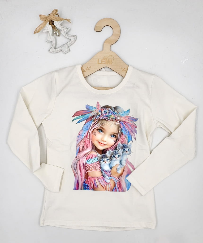 Na środku bluzki znajduje się nadruk pięknej dziewczynki w kolorowym pióropuszu z trzema kotkami, ozdobiony kolorowymi dżetami, które dodają bluzce wyjątkowego uroku. Nadruk jest trwały i nie pęka w praniu – zaleca się pranie na lewej stronie.