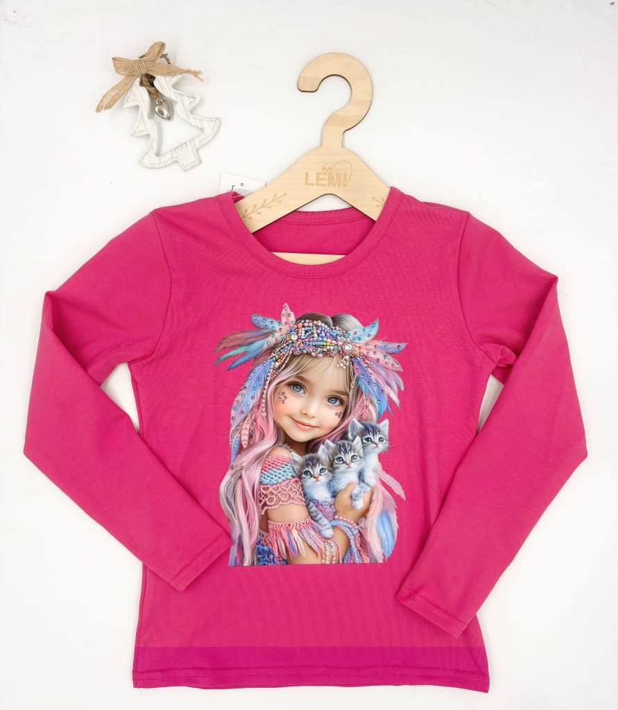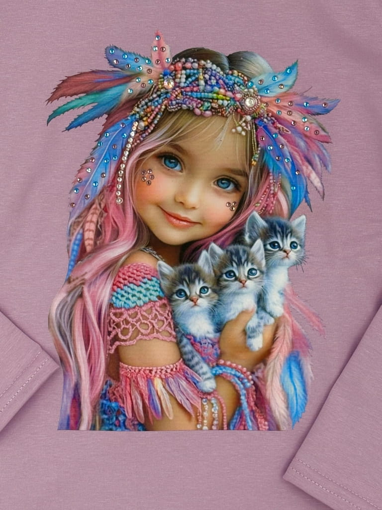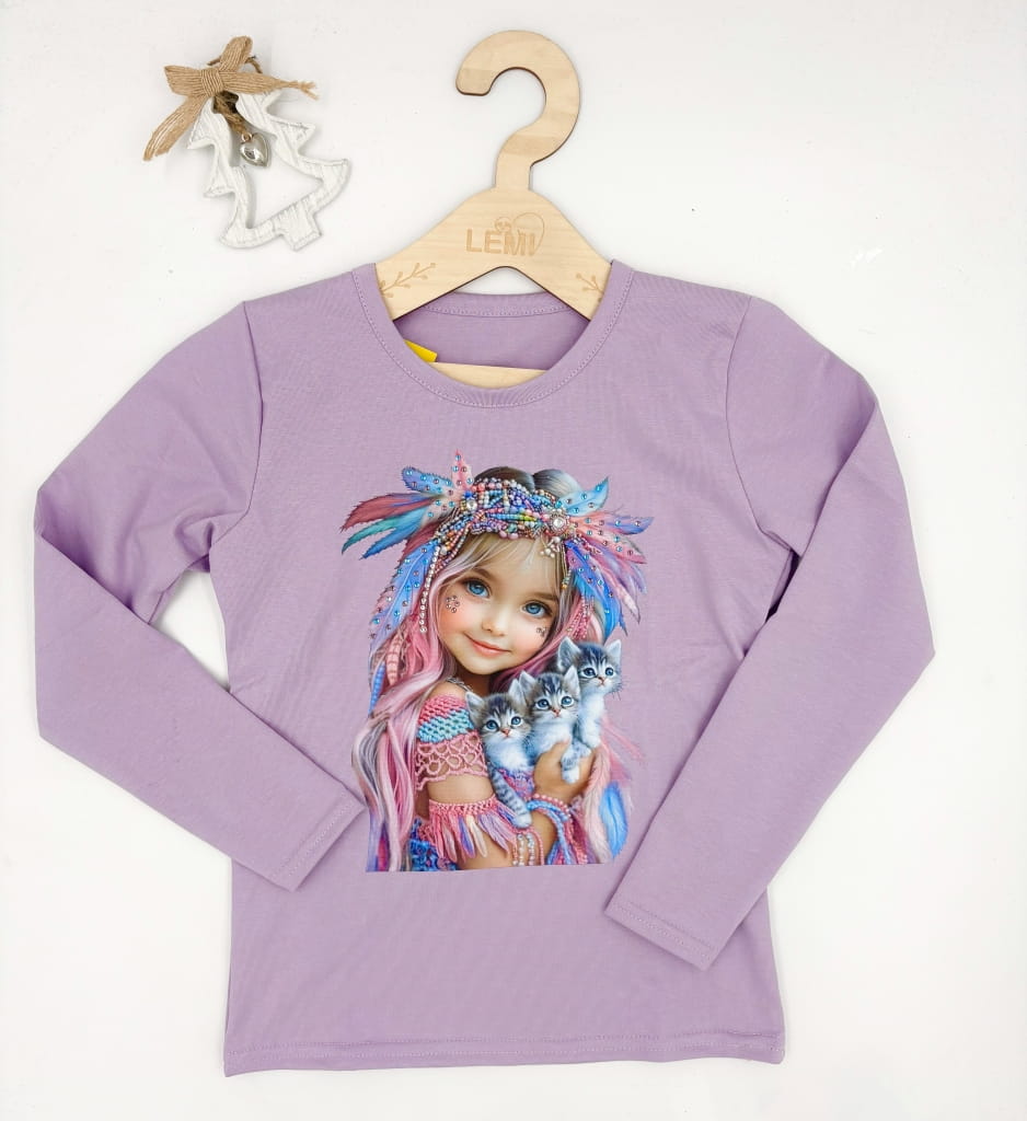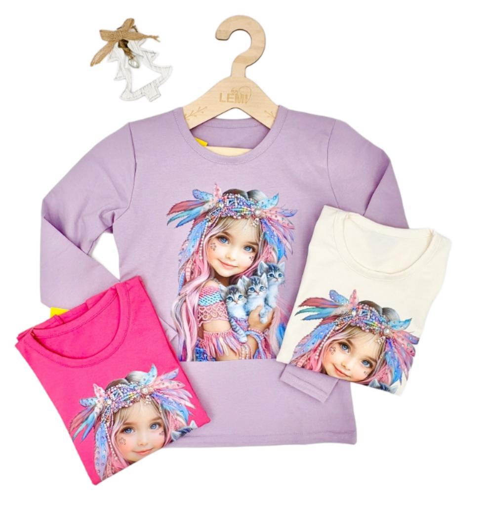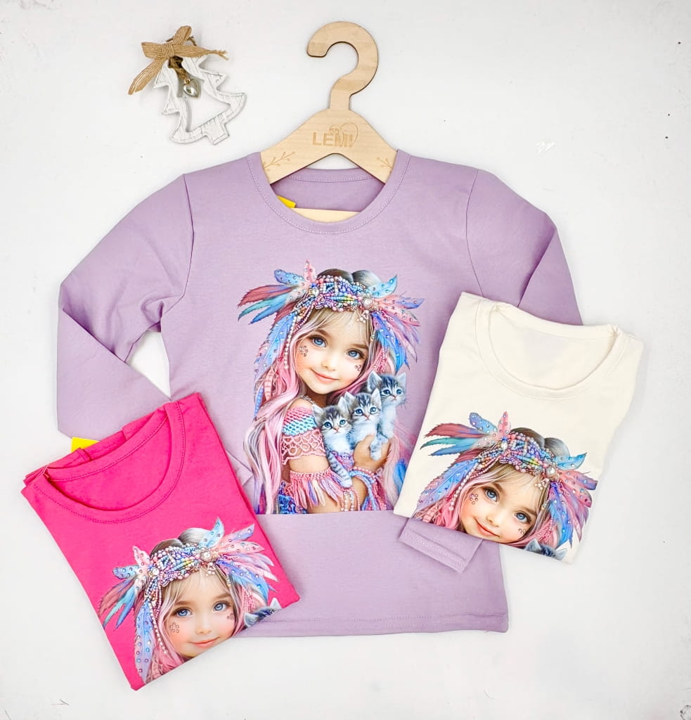 Stylowa bluzka dla dziewczynki od polskiej firmy Lidia, wykonana z 95% bawełny i 5% elastanu. Na środku nadruk dziewczynki w kolorowym pióropuszu z trzema kotkami, ozdobiony kolorowymi dżetami. Trwały nadruk, delikatnie obszyta szyja, nie rozciąga się ani nie traci fasonu po praniu. Idealna na prezent świąteczny lub codzienne noszenie.