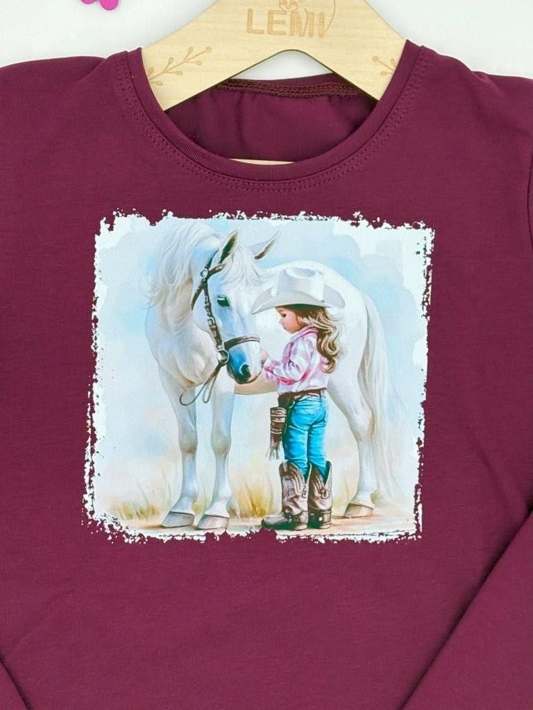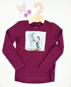 Bluzka dziewczęca z długim rękawem i koniem AIPI. Polska produkcja, bawełna z elastanem. Wygodna, trwały nadruk, idealna z legginsami.