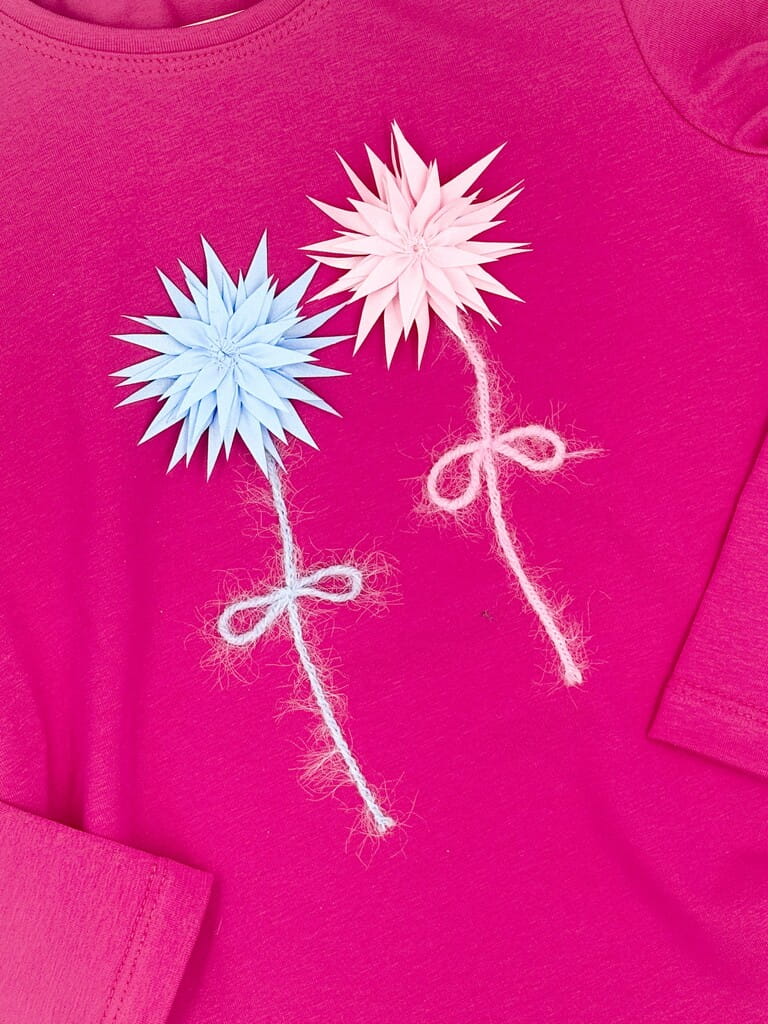 Uwagę przyciągają piękne, dwukolorowe kwiaty naszyte z materiału, z wyjątkowymi łodyżkami wykonanymi z włóczki, które nadają bluzce oryginalnego, dziewczęcego charakteru. Naszywki są trwałe – nawet po praniu na lewej stronie nic się z nimi nie dzieje.
