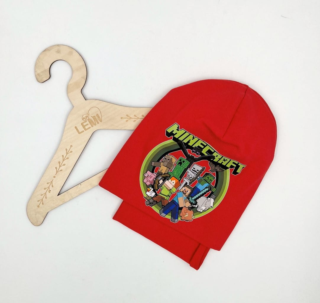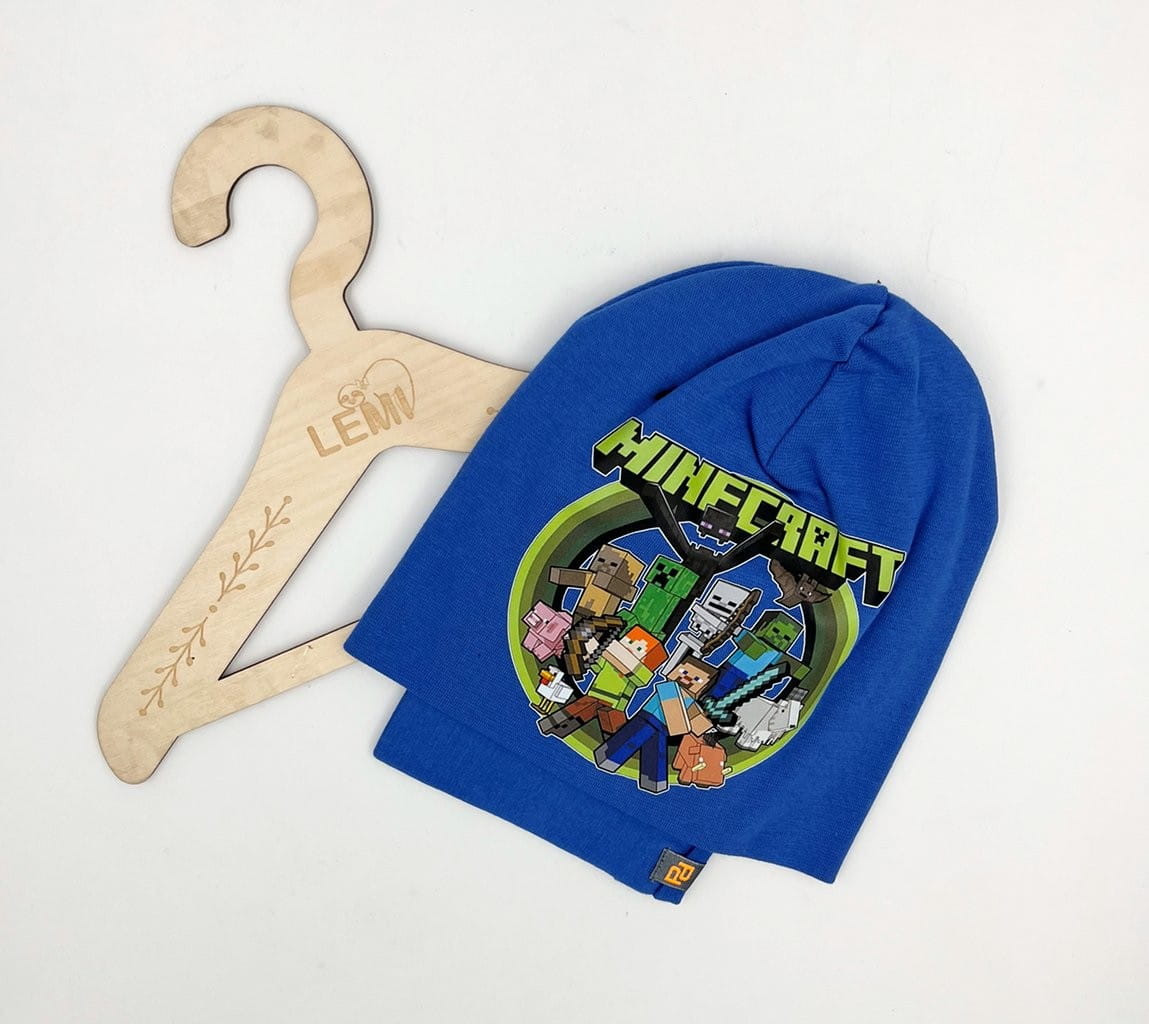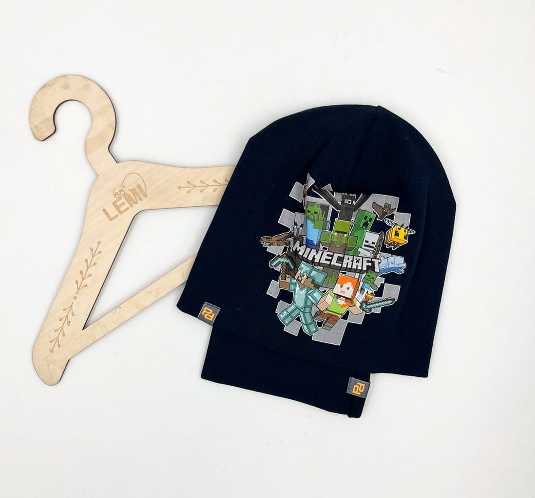 Komplet chłopięcy – czapka i komin Minecraft dla dzieci 3–8 lat. Polska produkcja, podwójny materiał bawełniany (95%) z elastanem, trwały nadruk, można prać w pralce na lewej stronie. Czapka mierzona na płasko: 20×20 cm.