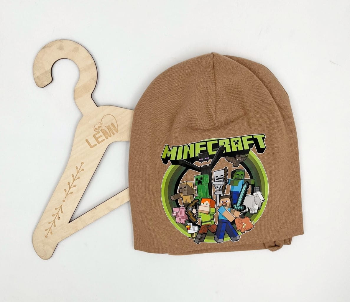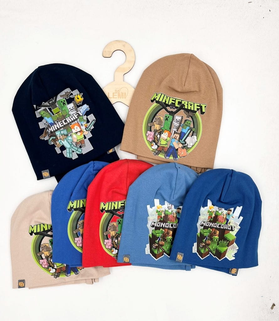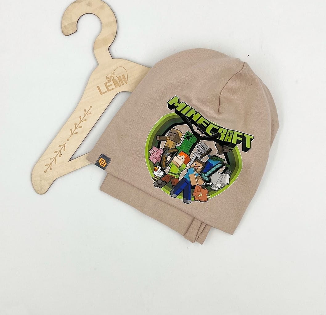 Komplet chłopięcy – czapka i komin Minecraft dla dzieci 3–8 lat. Polska produkcja, podwójny materiał bawełniany (95%) z elastanem, trwały nadruk, można prać w pralce na lewej stronie. Czapka mierzona na płasko: 20×20 cm.