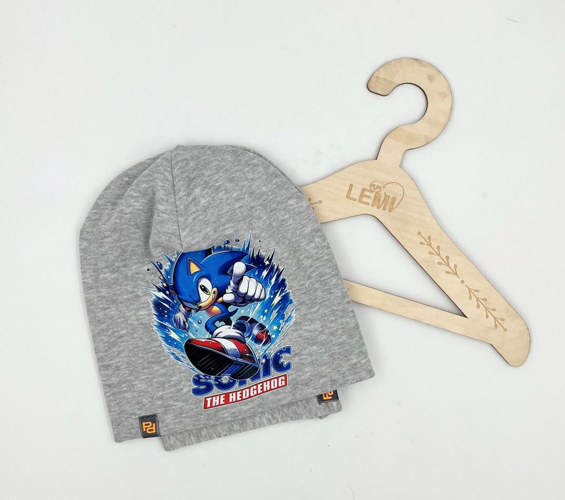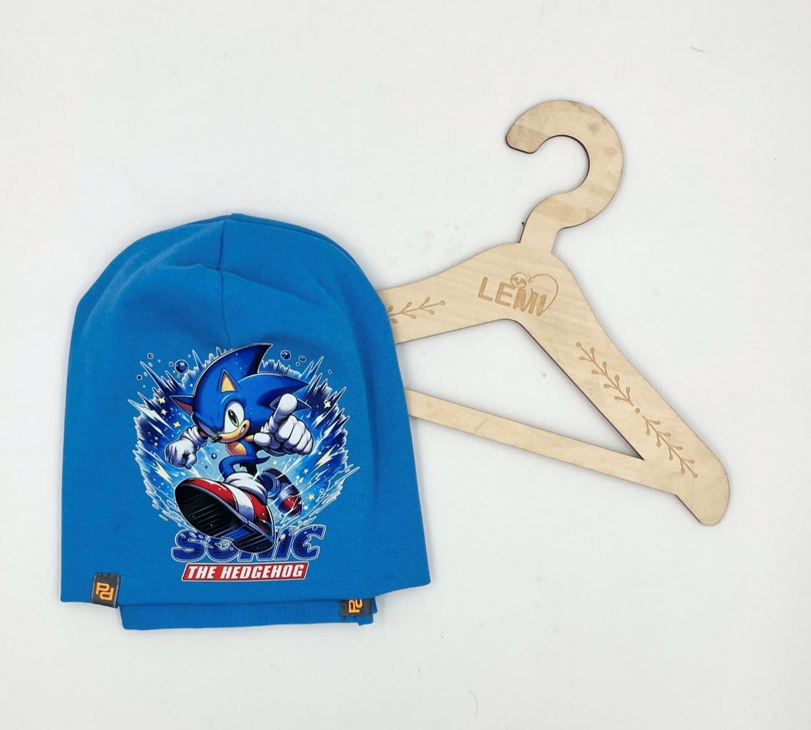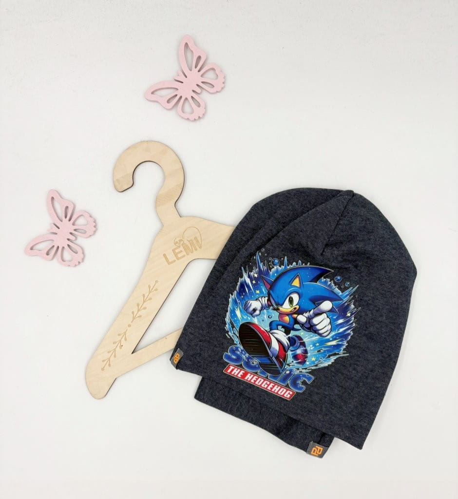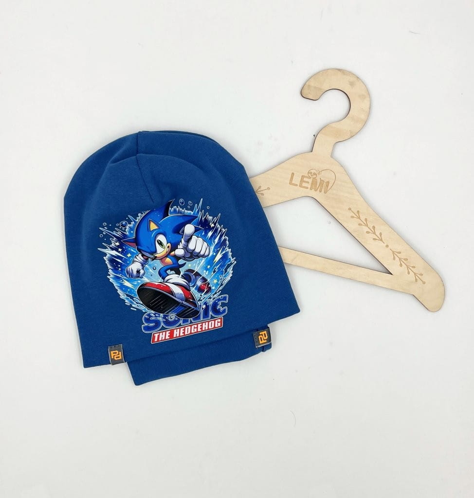 Bawełniany komplet dla chłopca: czapka z podwójnym materiałem i komin. Polska produkcja, trwały nadruk Sonic, komfortowy i ciepły na jesień i zimę.