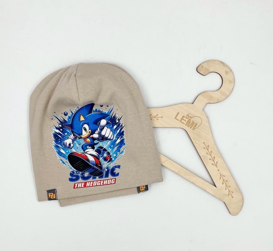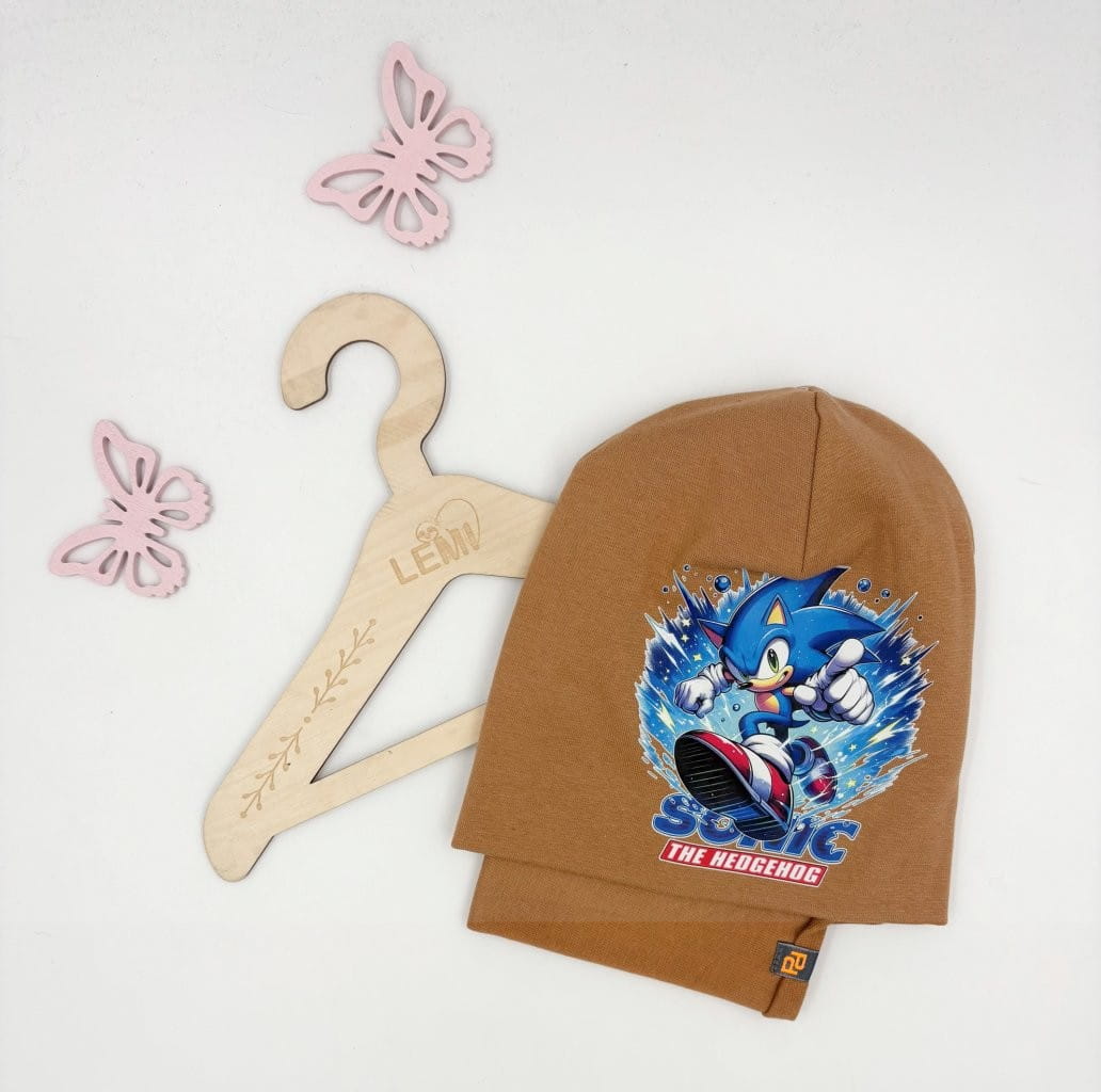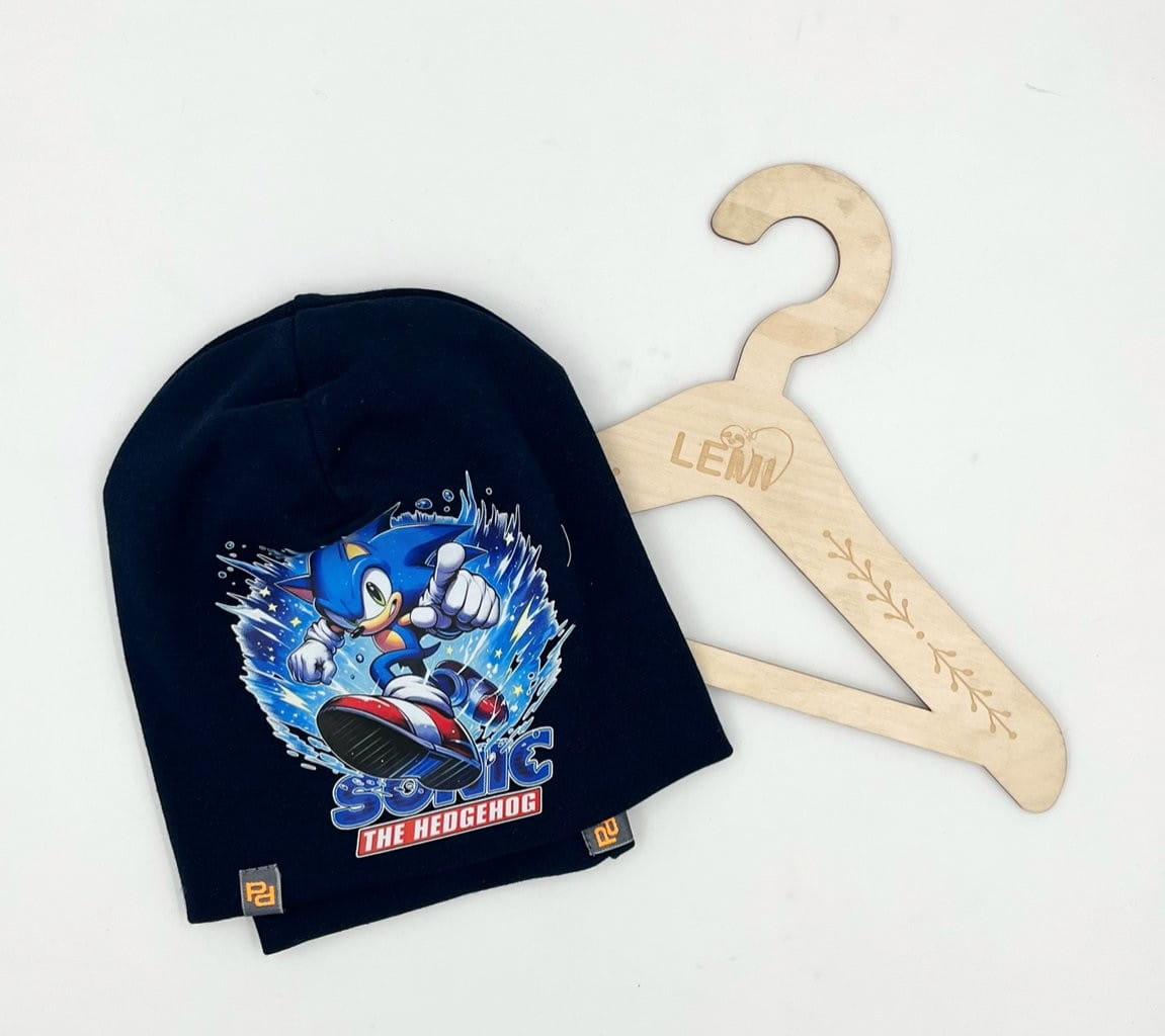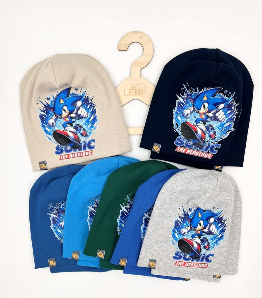 Bawełniany komplet dla chłopca: czapka z podwójnym materiałem i komin. Polska produkcja, trwały nadruk Sonic, komfortowy i ciepły na jesień i zimę.