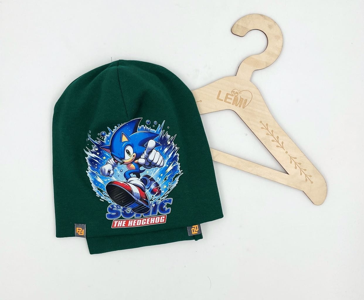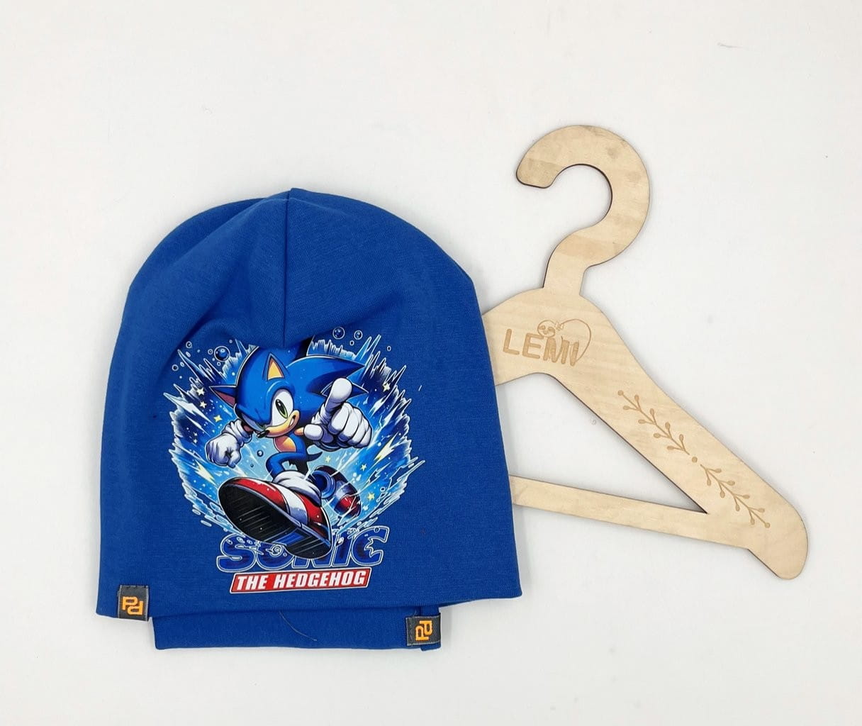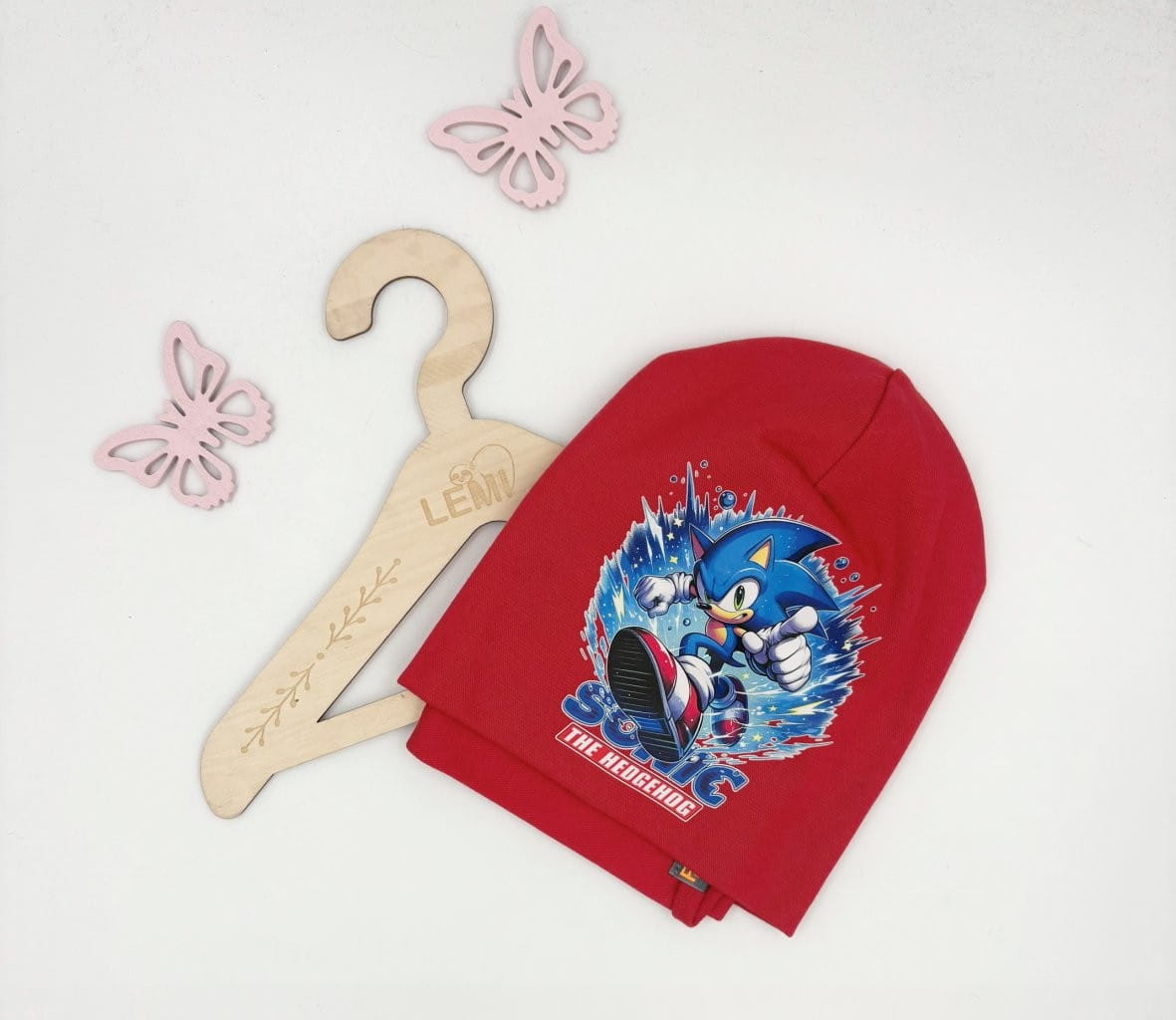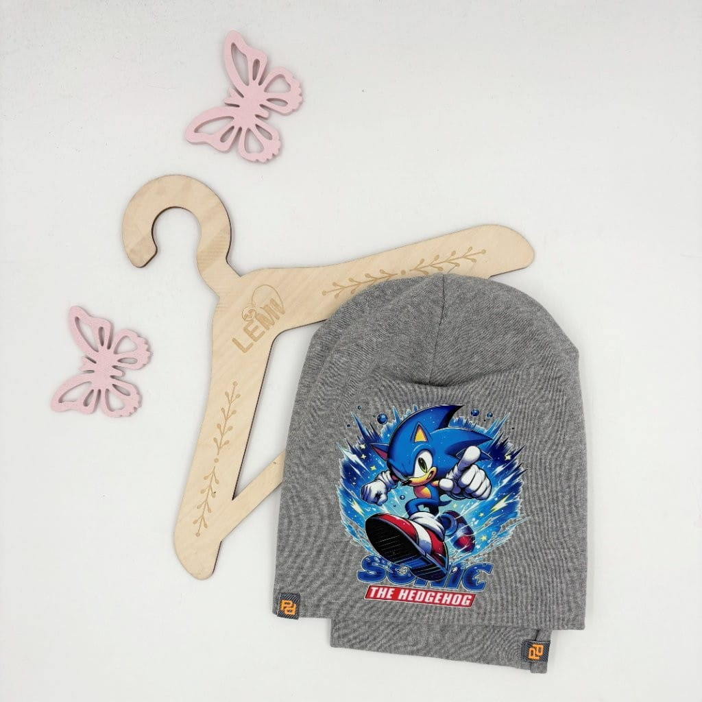 Bawełniany komplet dla chłopca: czapka z podwójnym materiałem i komin. Polska produkcja, trwały nadruk Sonic, komfortowy i ciepły na jesień i zimę.