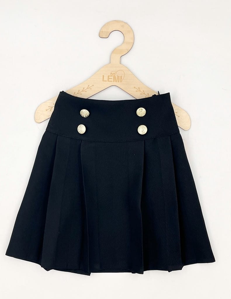 Elegancka czarna spódniczka plisowana dla dziewczynki marki Madżi. Idealna spódniczka na zakończenie roku szkolnego, akademie i uroczystości. Zdobiona złotymi guzikami, z tyłu elastyczna gumka – gwarantuje wygodę i dopasowanie. Polska produkcja, klasyczny fason.