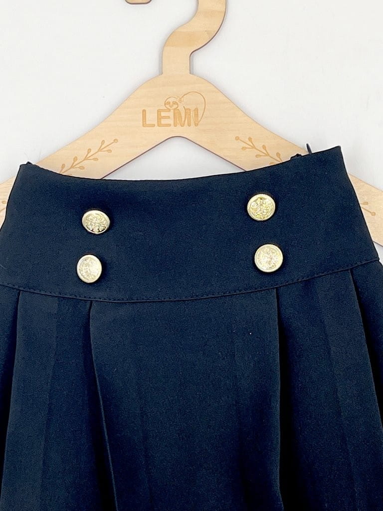 Z przodu spódniczkę zdobią cztery ozdobne złote guziki, które dodają całości klasy i szyku. Z tyłu znajduje się elastyczna gumka, dzięki której spódniczka idealnie dopasowuje się do talii, zapewniając wygodę przez cały dzień.