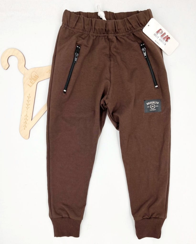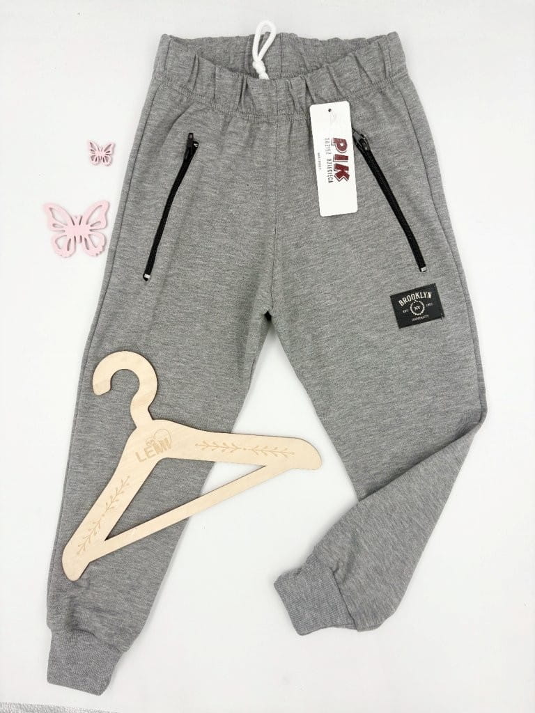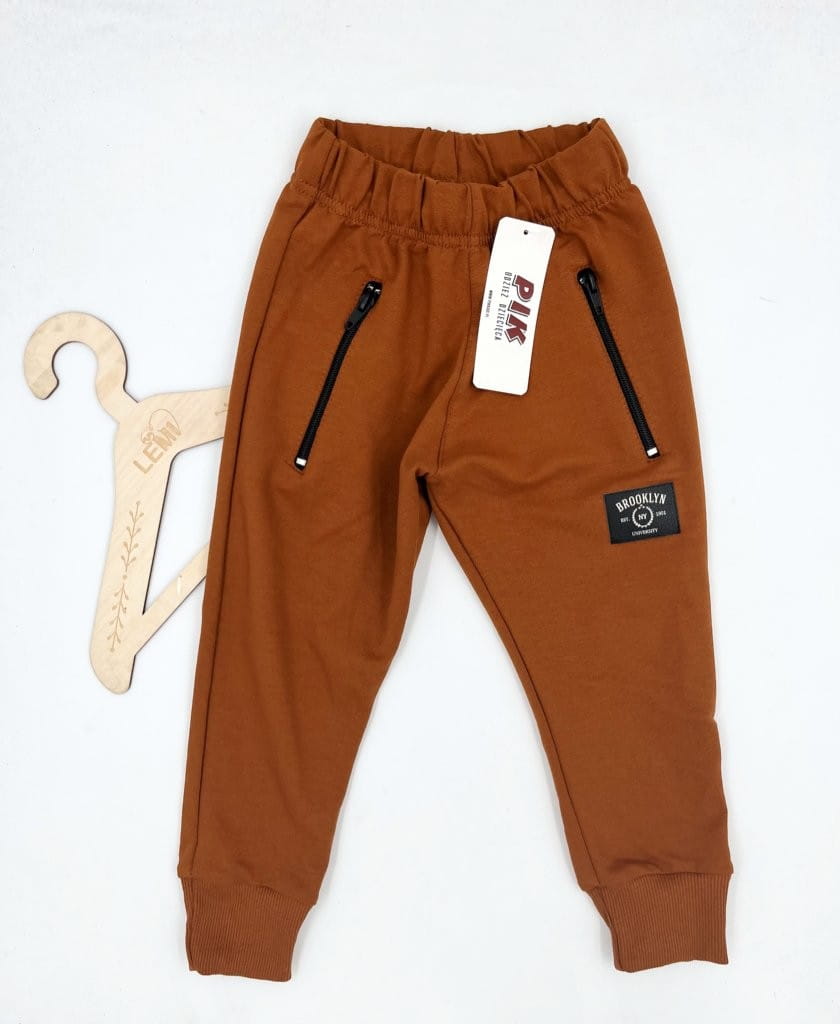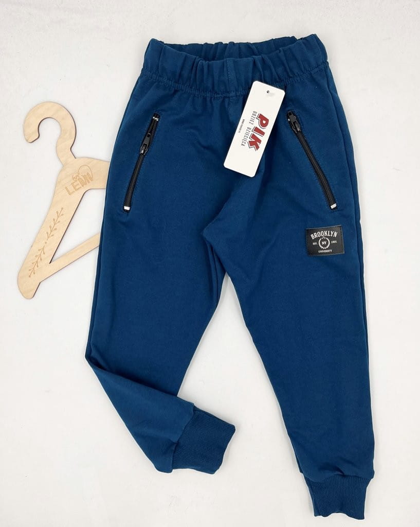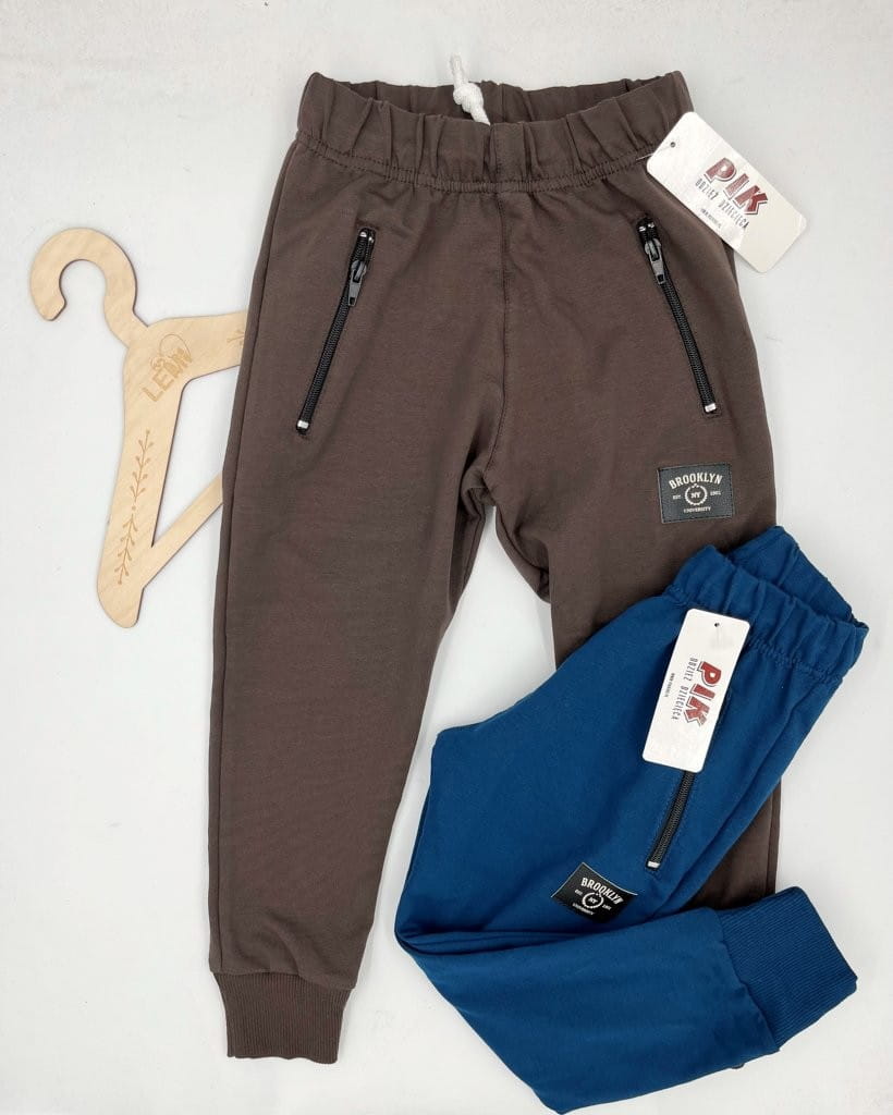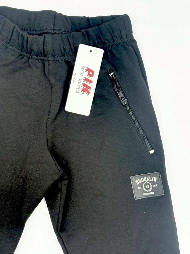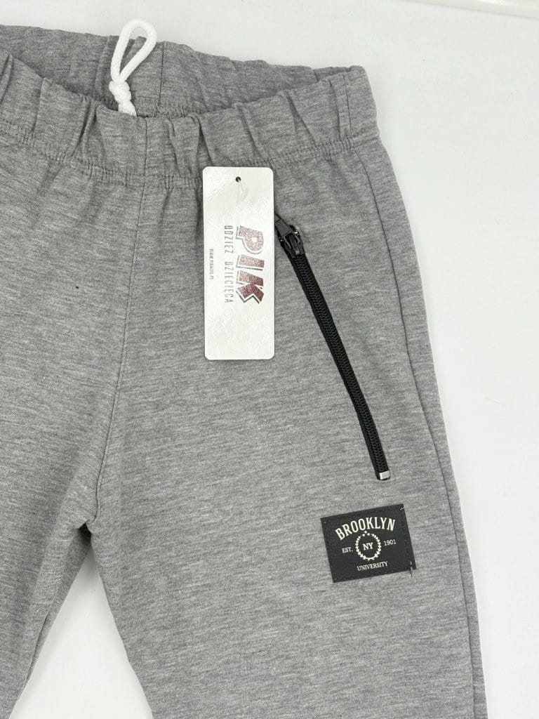 Spodnie dresowe chłopięce PIK – wygodne i elastyczne spodnie dla aktywnych chłopców. Wykonane z bawełny z elastanem (96%/4%), z gumką i sznurkiem w pasie, kieszeniami na zamki oraz ściągaczami na nogawkach. Idealne na co dzień, do szkoły i na trening. Nowoczesny miejski styl podkreśla czarna naszywka „Brooklyn”.