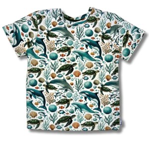 Koszulka przyciąga wzrok efektownym nadrukiem 3D z motywami morskimi, takimi jak delfiny, żółwie czy rafy koralowe. To doskonały wybór dla małych odkrywców i miłośników oceanu.
