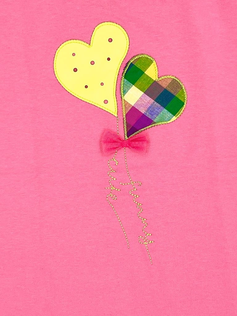 Na froncie koszulki znajduje się efektowna aplikacja baloników w kształcie serc, wykonanych z ekoskóry i miękkiego, dekoracyjnego materiału. To połączenie faktur dodaje koszulce dziewczęcego uroku i nowoczesnego stylu.