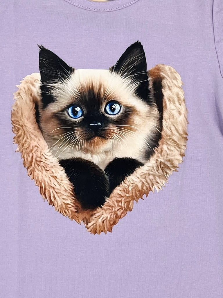 Na przodzie koszulki znajduje się śliczny nadruk kotka, który dodaje jej wyjątkowego, dziewczęcego charakteru. Klasyczny krój oraz staranne wykończenie sprawiają, że t-shirt świetnie dopasowuje się do sylwetki, nie krępując ruchów dziecka.