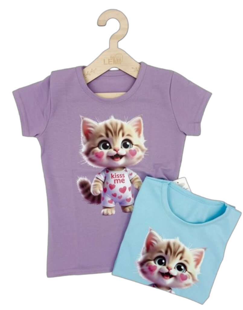 Bawełniany t-shirt dziewczęcy polskiej produkcji firmy Lidia z krótkim rękawem i uroczym nadrukiem kota w ubranku w serduszka. Wykonany z 96% bawełny i 4% elastanu, miękki, wygodny i trwały. Starannie wykończony dekolt i dół zapewniają długotrwały estetyczny wygląd. Idealny na Walentynki i na co dzień.