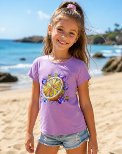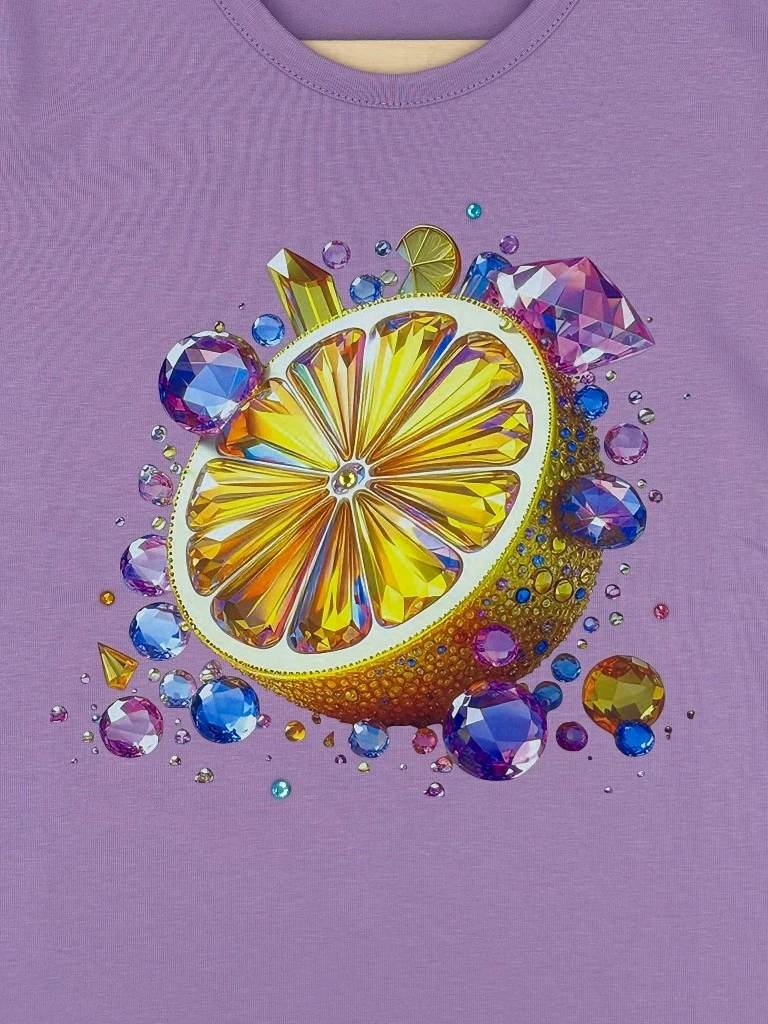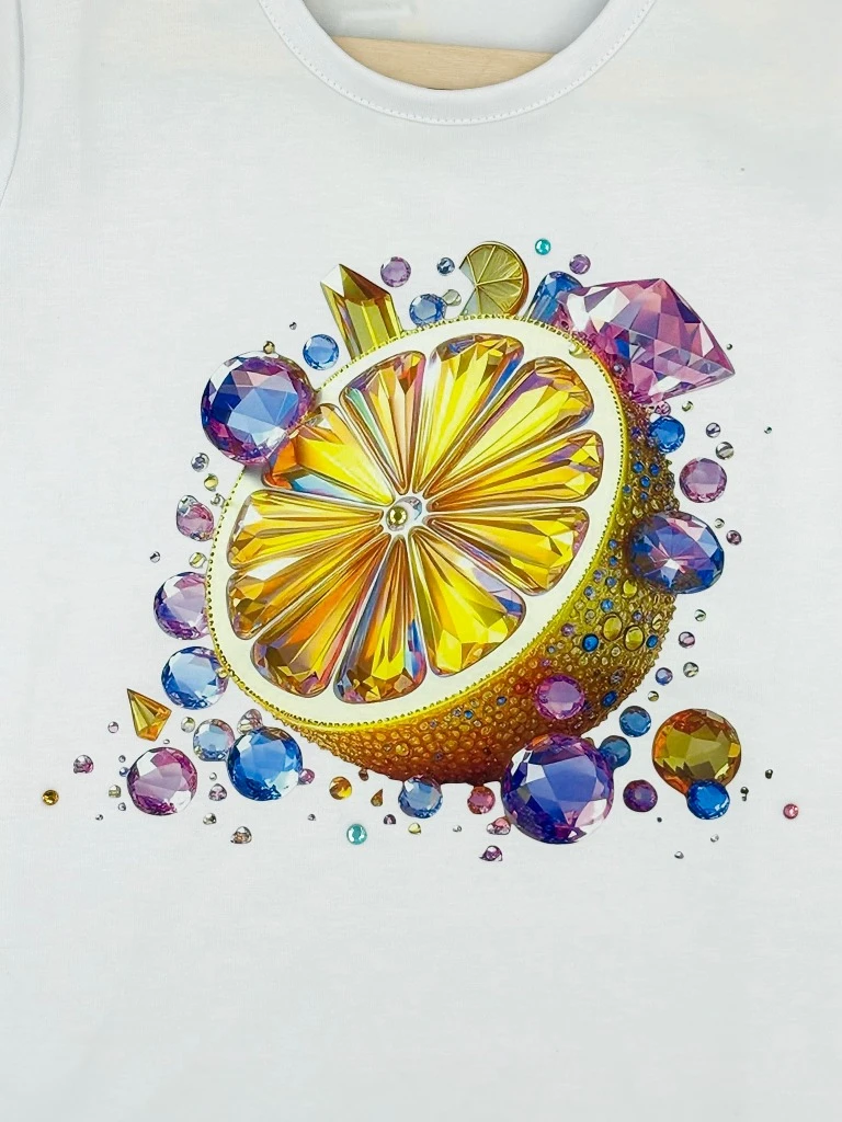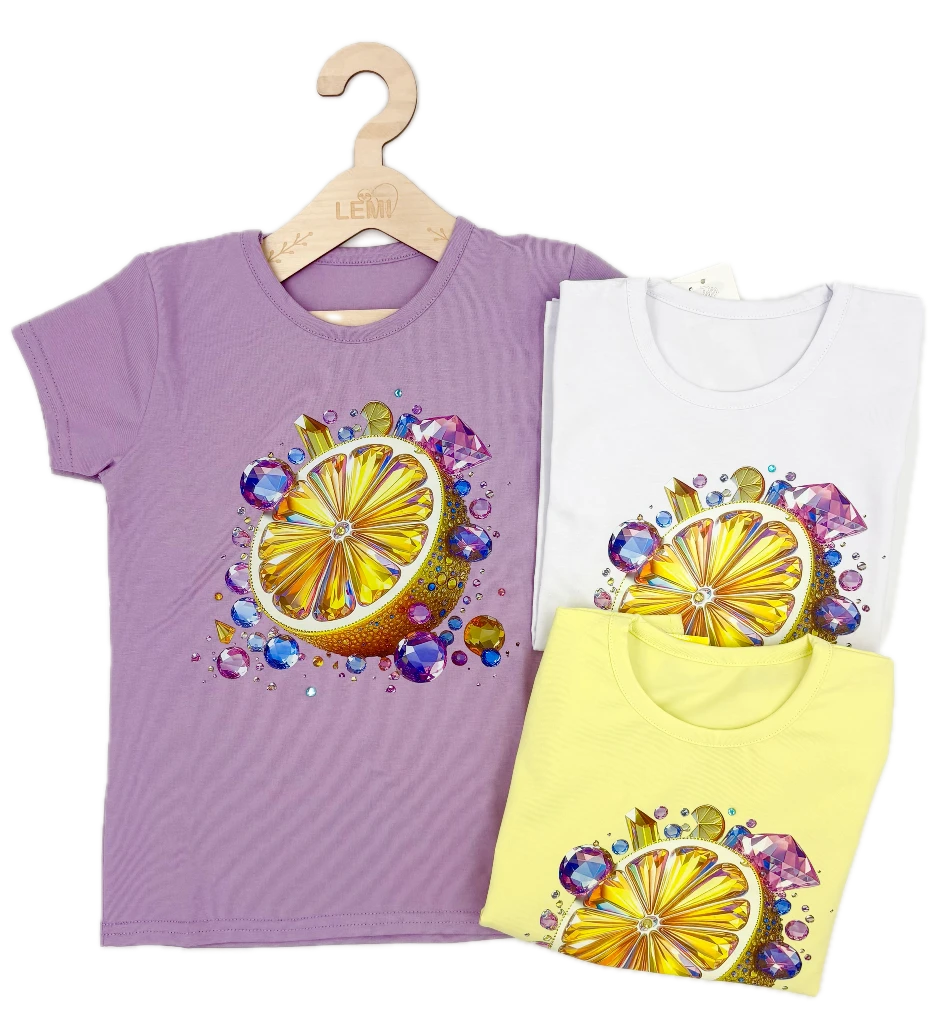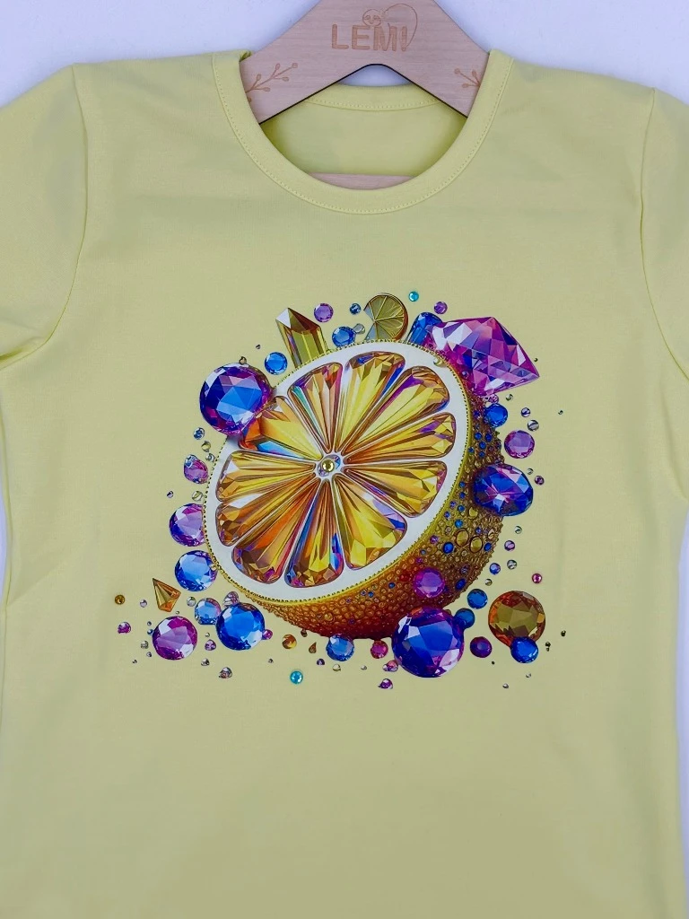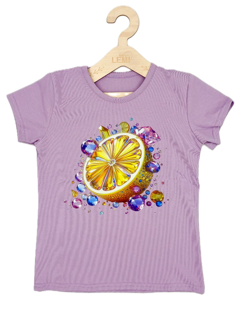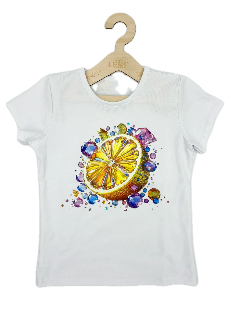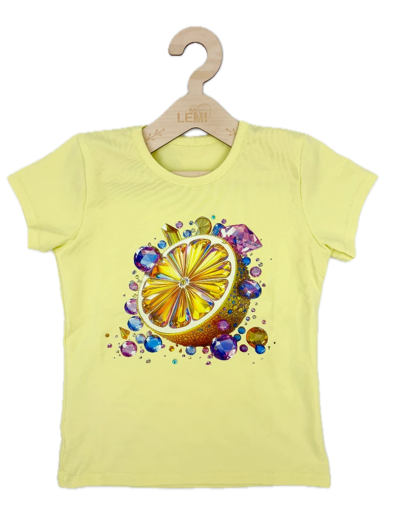 Bawełniany T-shirt dziewczęcy Lidia z efektownym nadrukiem cytrynki i kolorowymi dżetami. Wykonany z miękkiej, przewiewnej tkaniny, zapewnia komfort w ciepłe dni. Trwały, nie rozciąga się i zachowuje swój kształt po praniu.