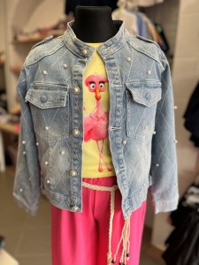 Dżinsowa kurtka dla dziewczynki – turecka produkcja, stójka, ozdobiona perełkami