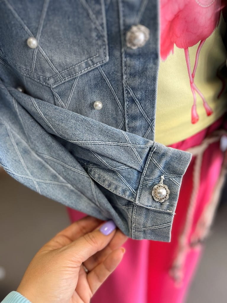 Kurtka dżinsowa dziewczęca z perełkami, stójka turecka miękka